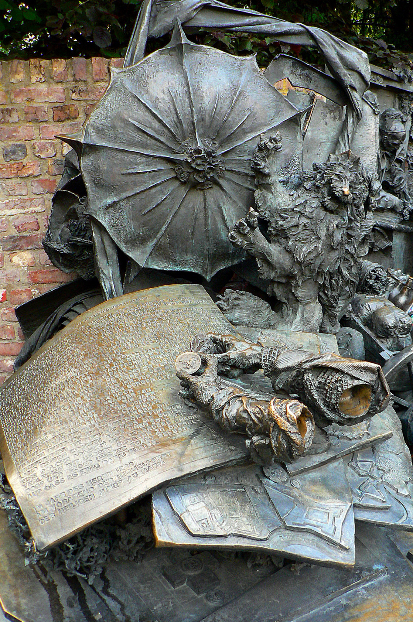 Escultura de calle con textos antiguos en metal. Dusselforf, Alemania