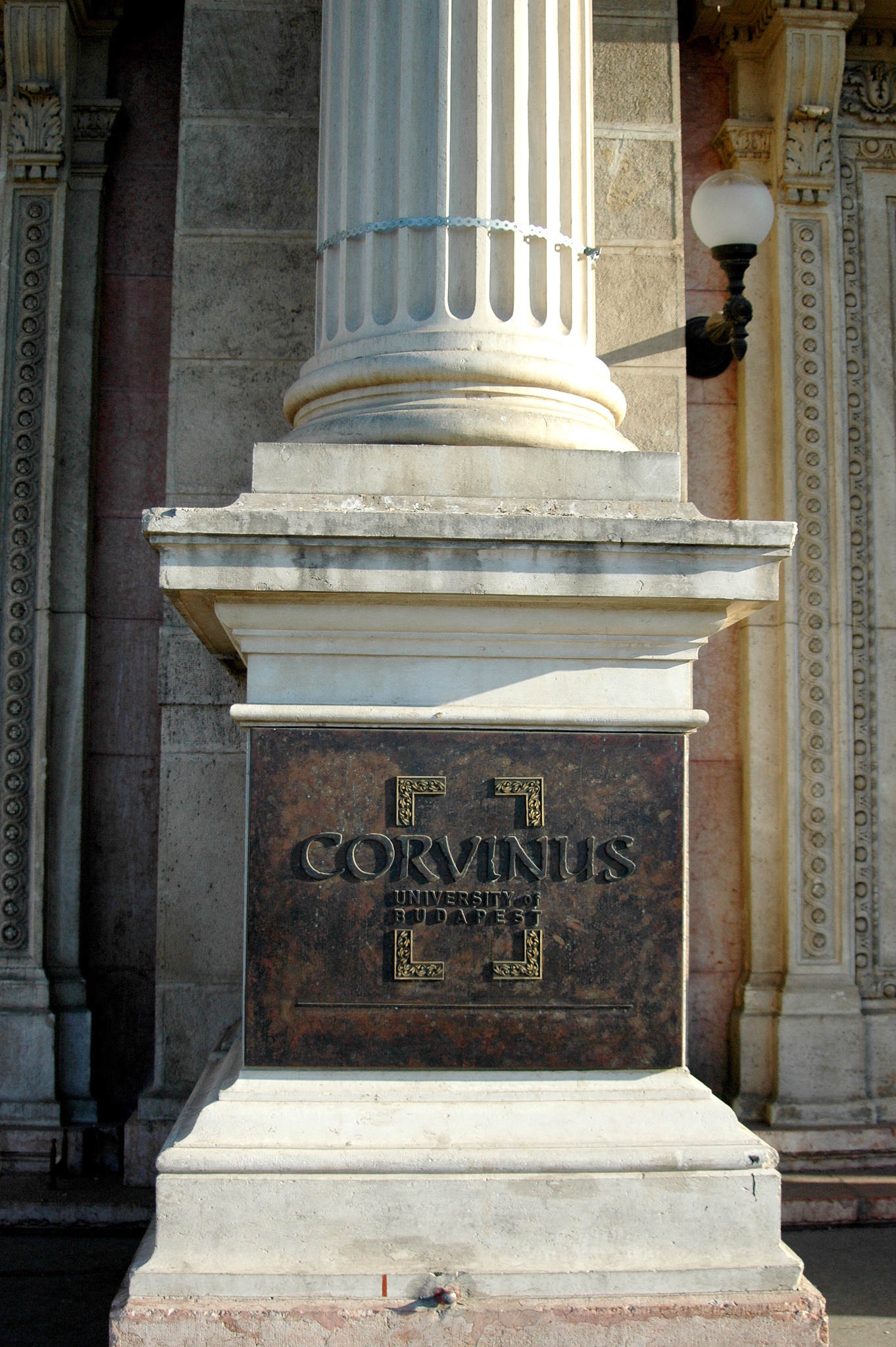 Columna con letrero de la Universidad de Corvinus, Budapest, Hungría