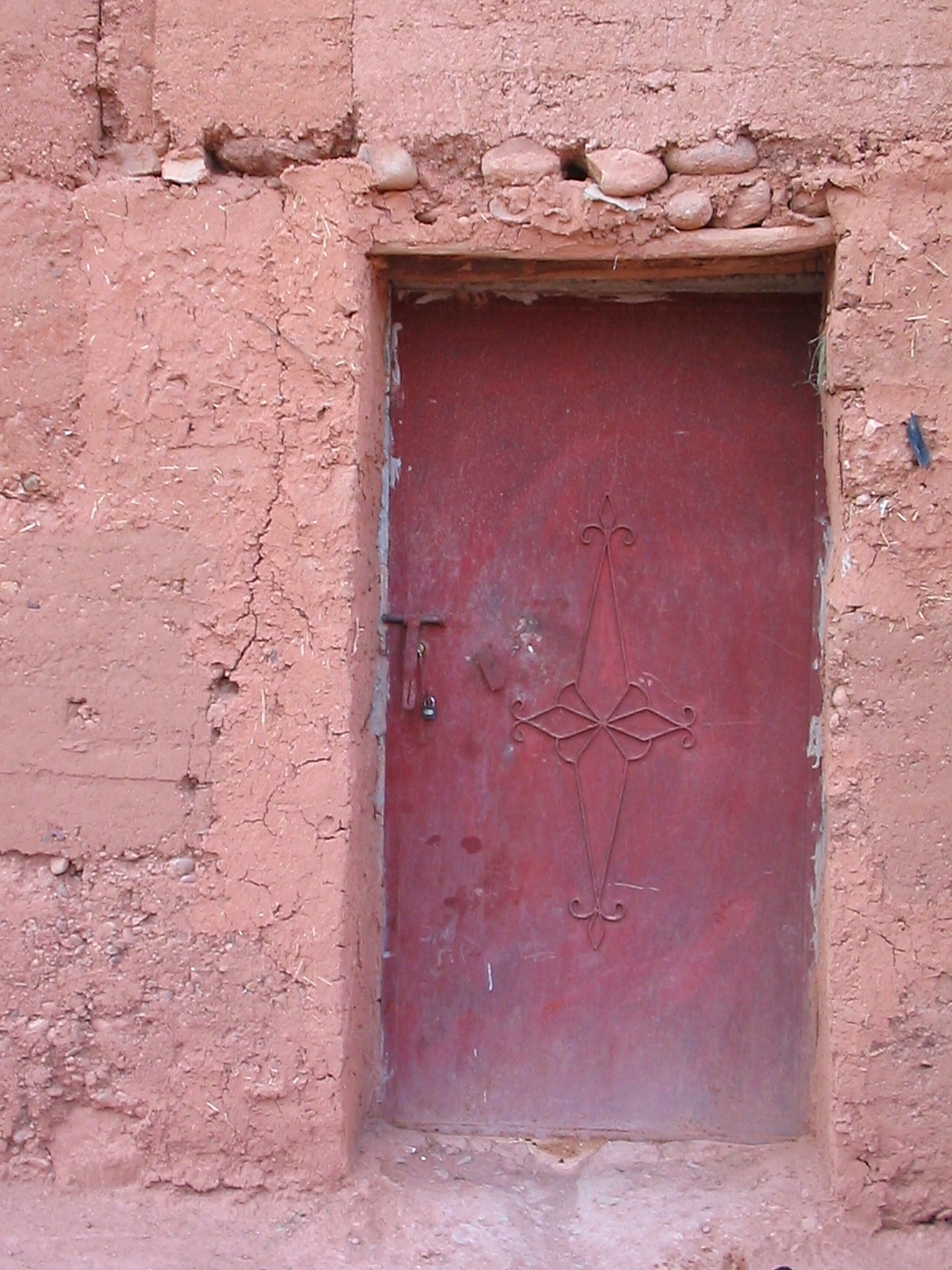 Puerta metálica de una construcción de adobe, Achahoud, Marruecos