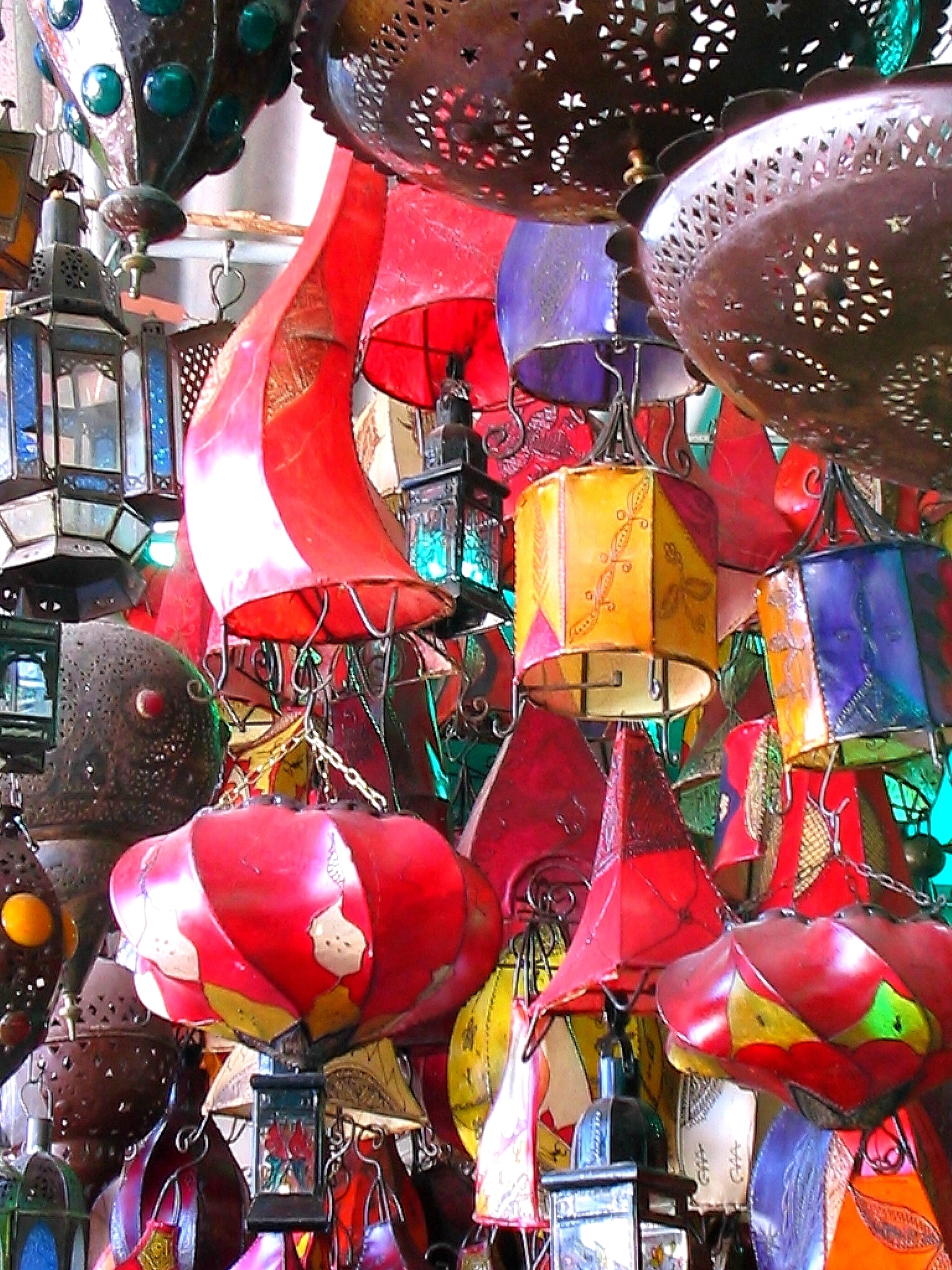 Lámparas en un puesto del zoco, Marrakech., Marruecos