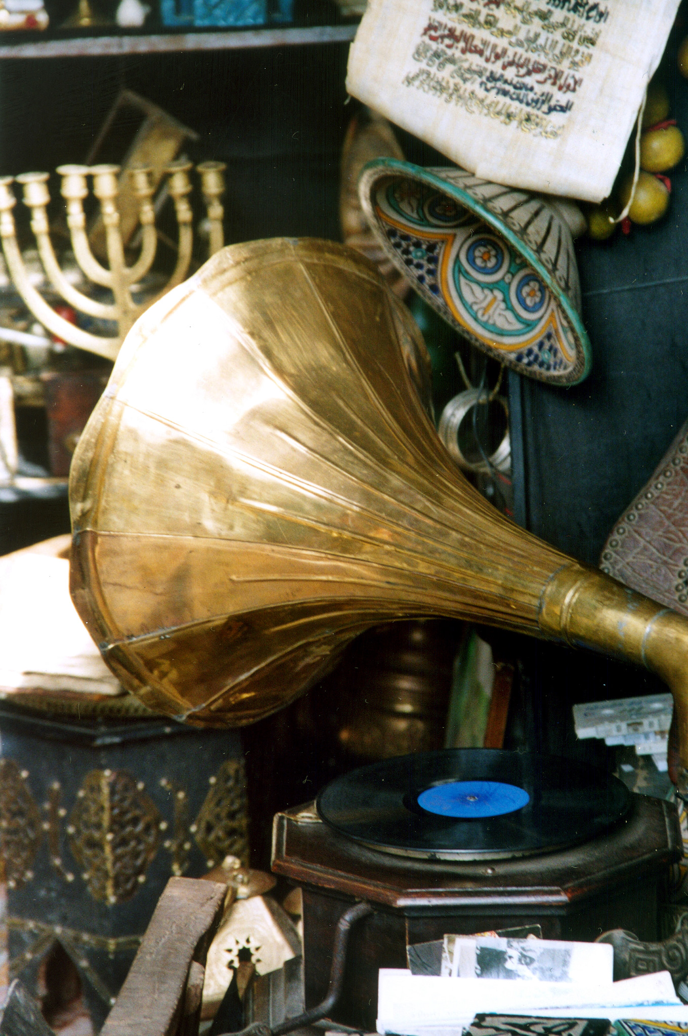 Fonógrafo en un puesto de un mercado, Marrakech, Marruecos