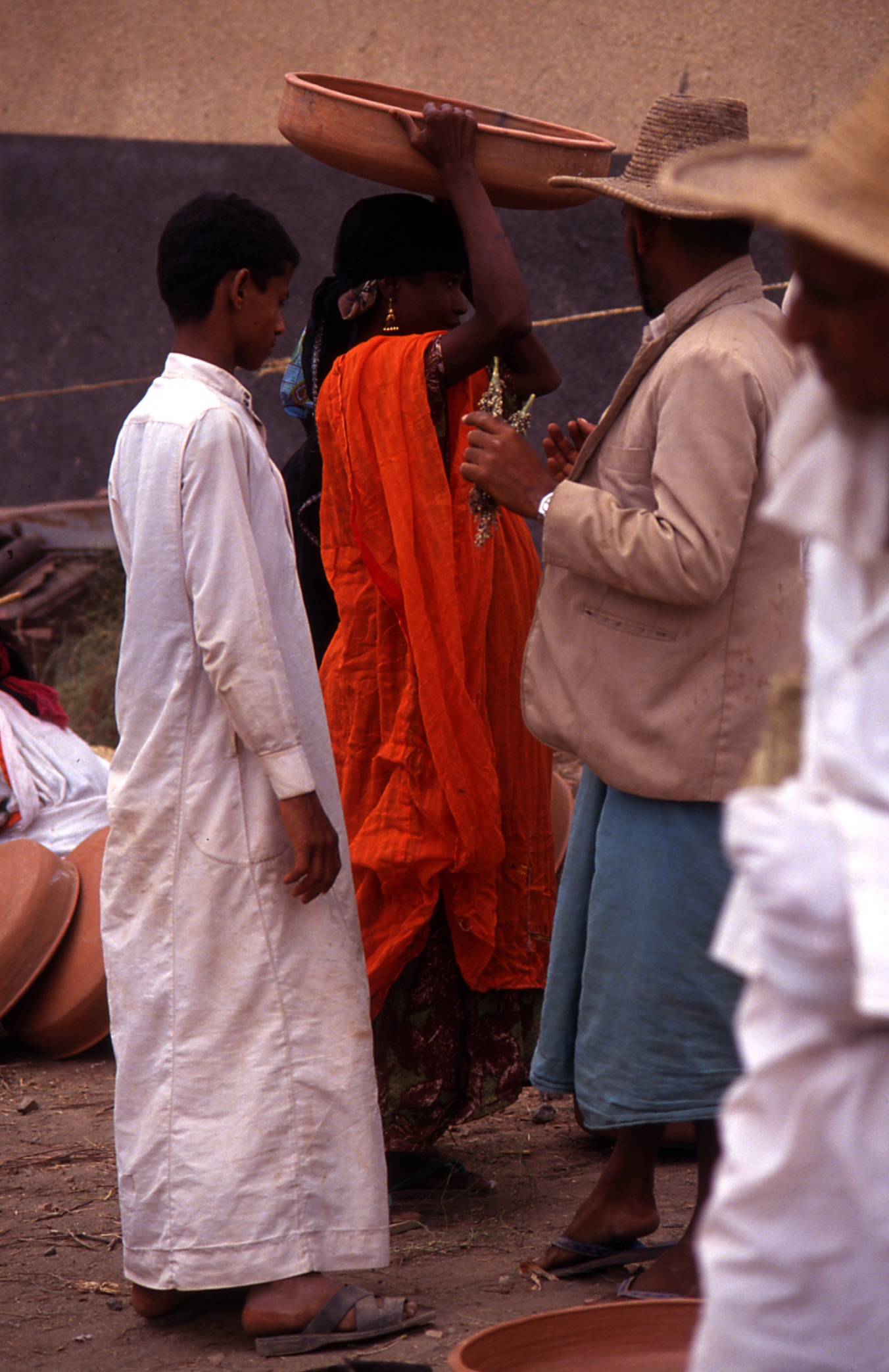 Mujer llevando un recipiente de barro en el mercado de Suq al Khamis, Yemen