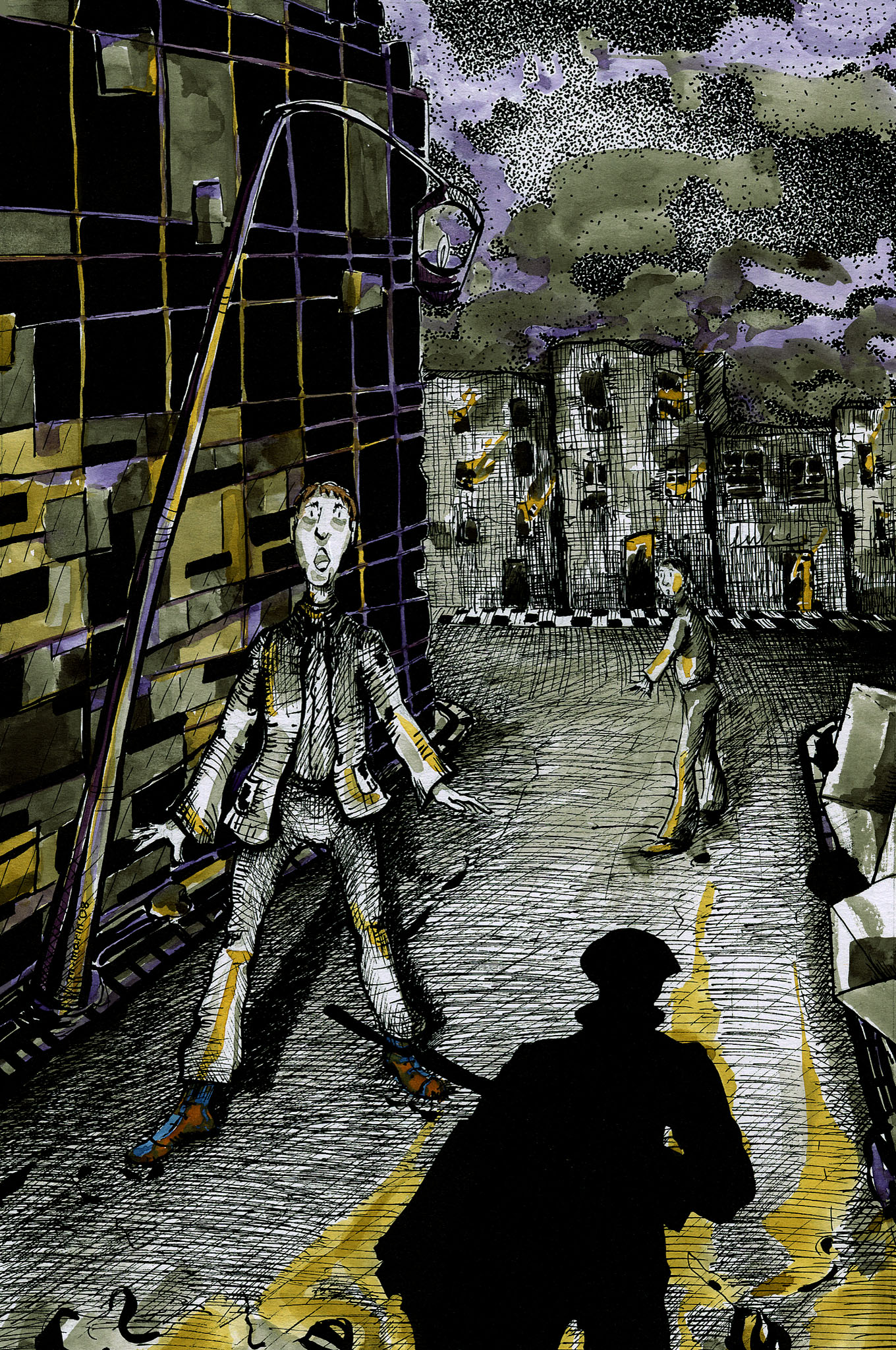 La forma de la espada: Un soldado, enorme en el resplandor, surgió de una cabaña incendiada