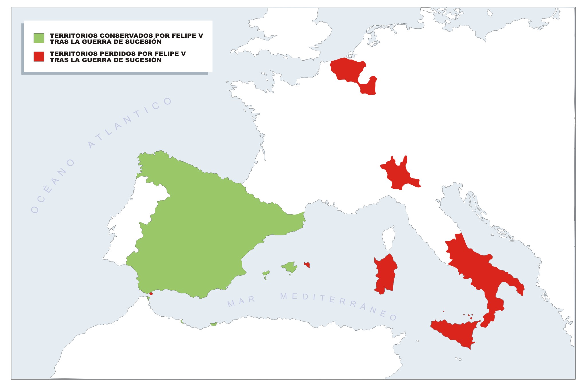 Mapa de los territorios conservados y perdidos por Felipe V en Europa tras la Guerra de Sucesión