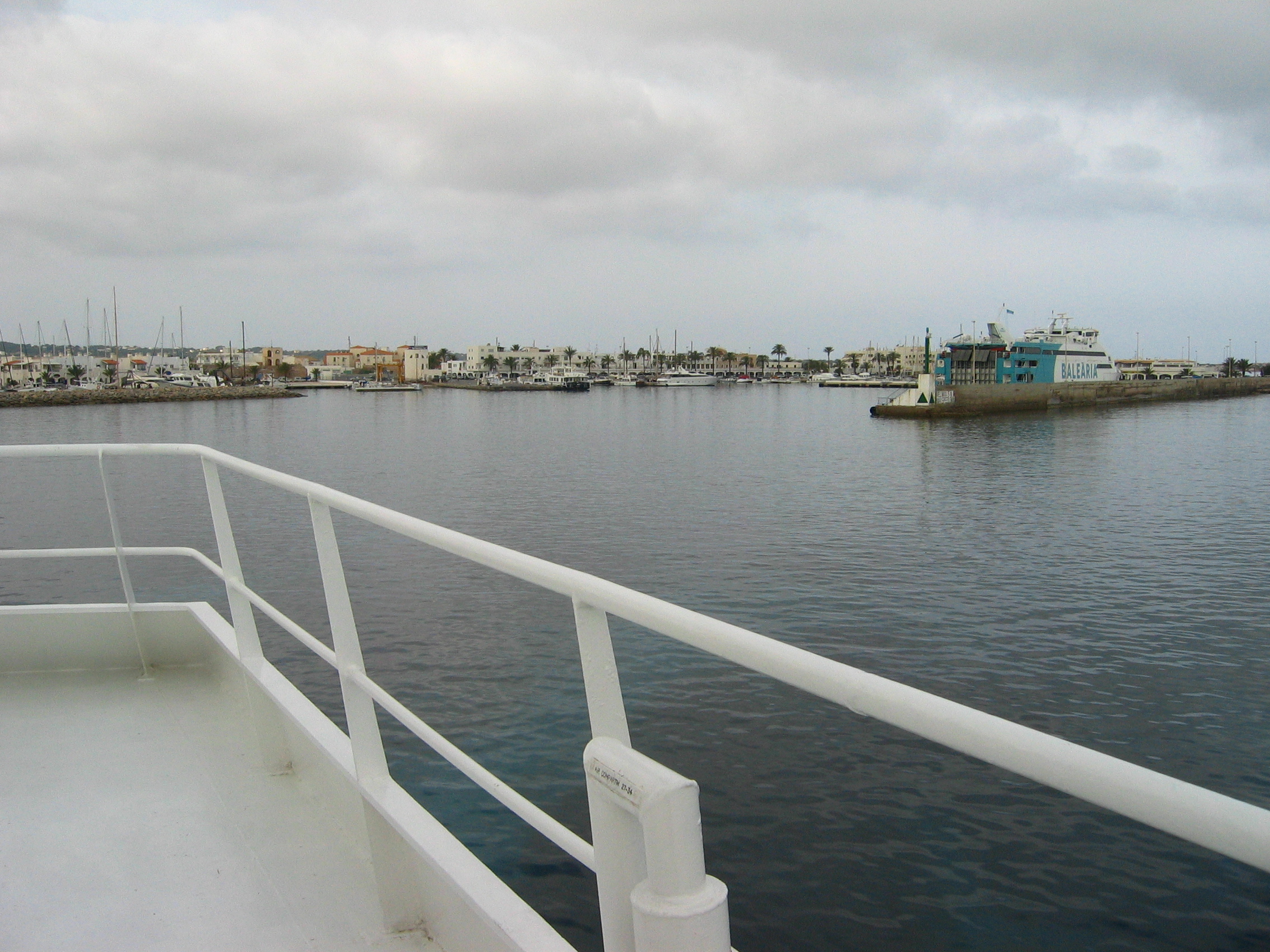 El barco entra en el puerto de La Sabina, Formentera, Islas Baleares