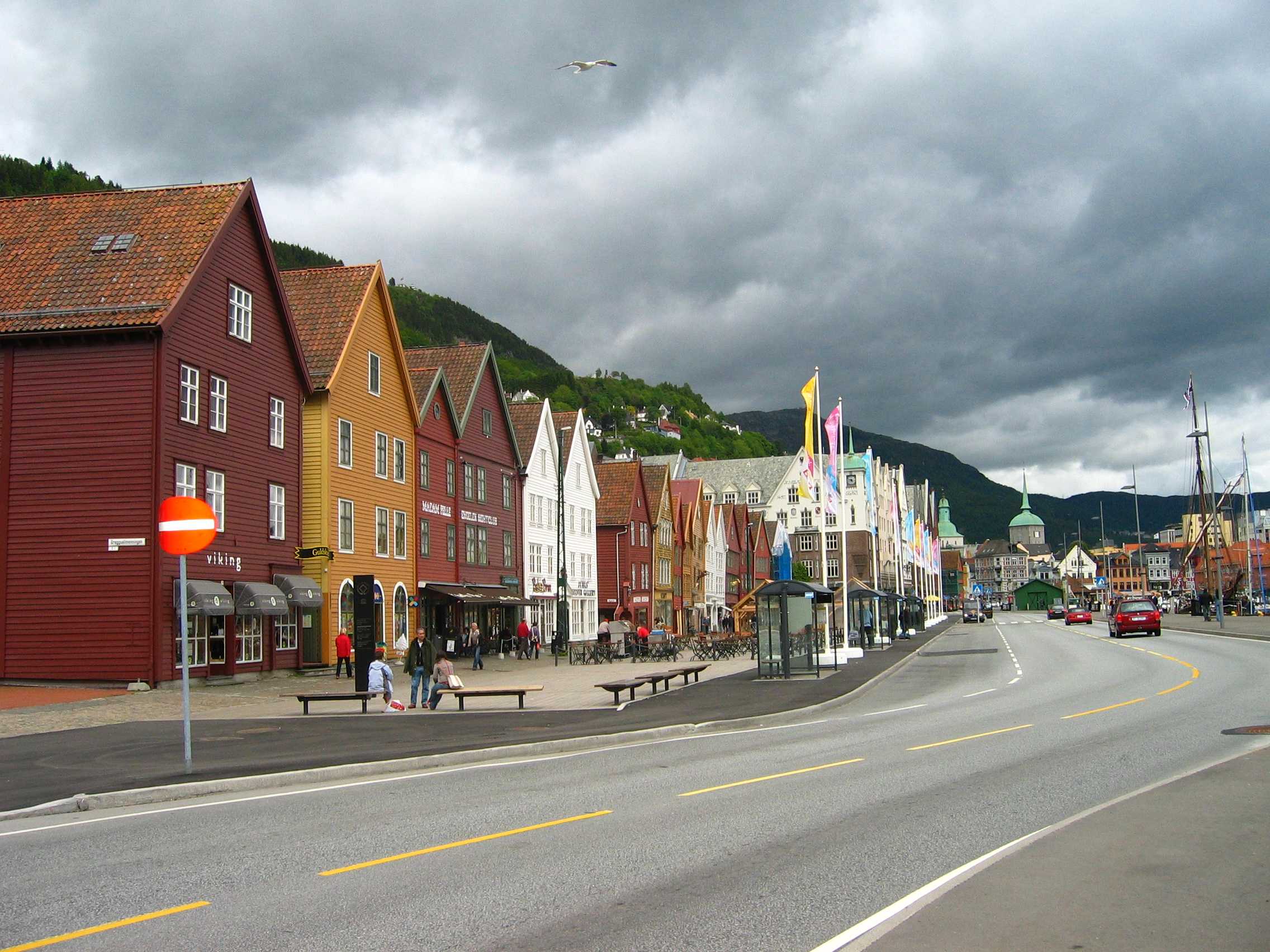 Vista general del muelle del Bryggen, Bergen, Noruega