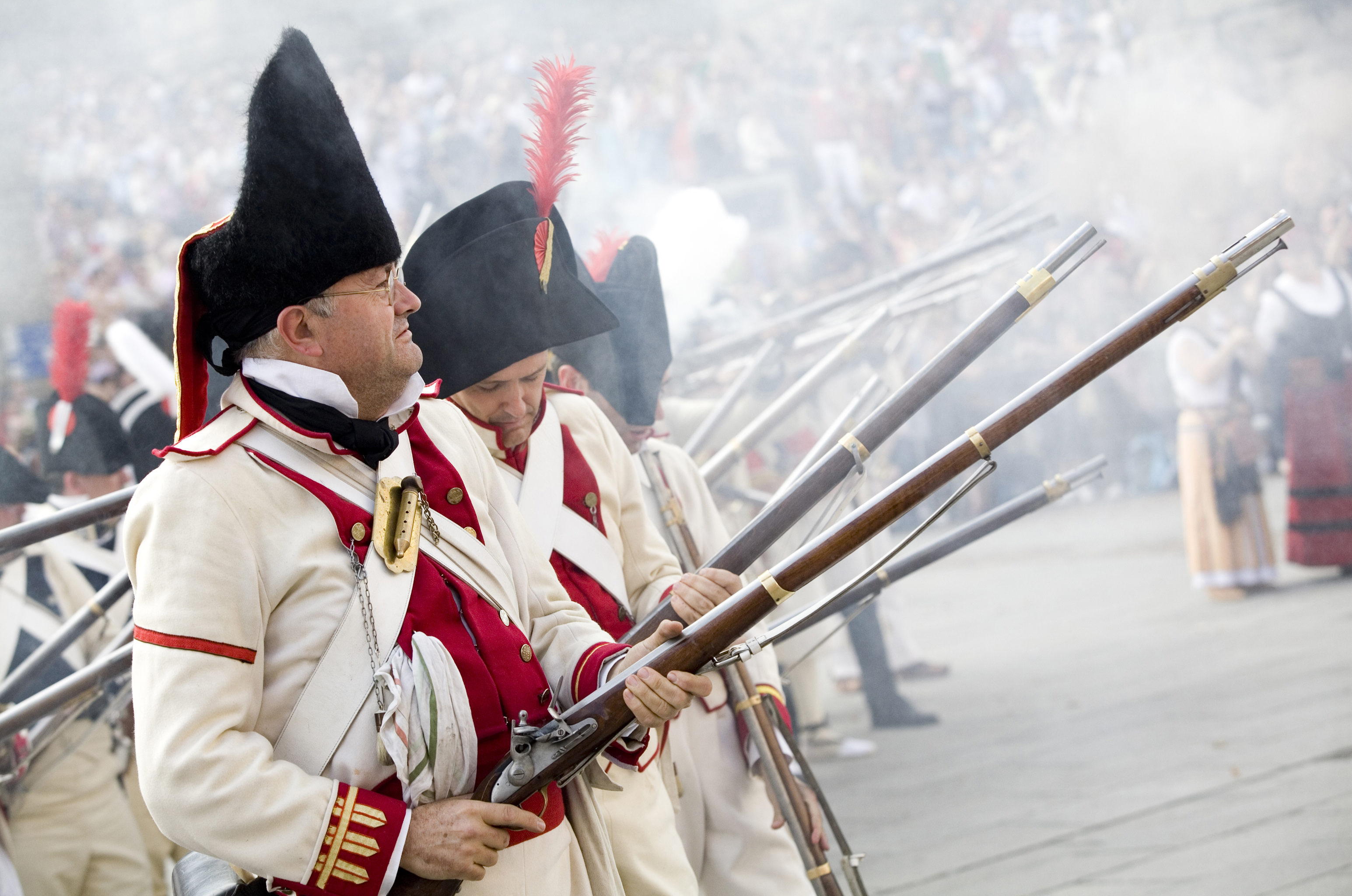 Recreación de la Guerra de la Independencia en Segovia: Soldados españoles en una demostración de disparos junto al Acueducto de Segovia