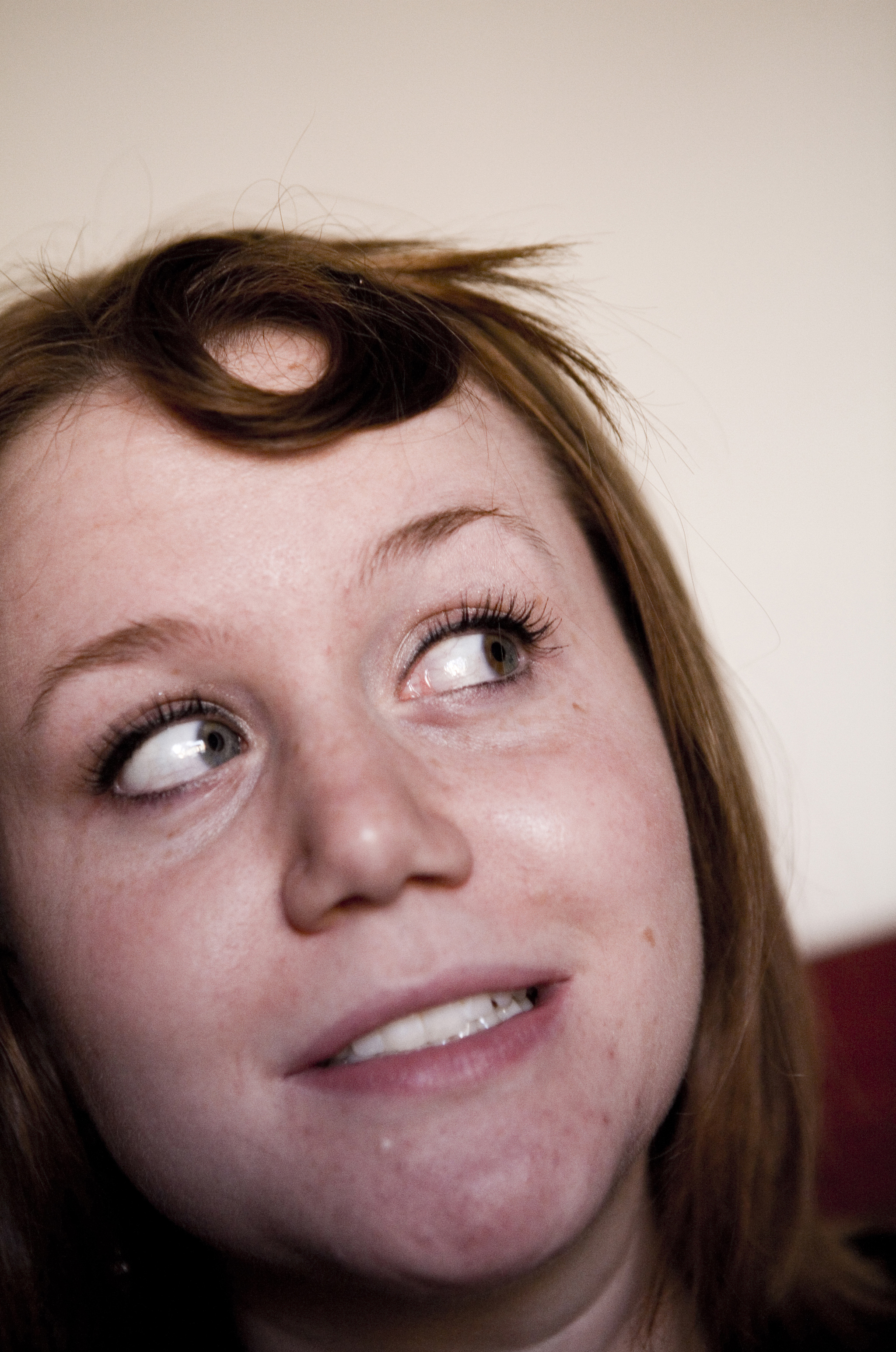 Primer plano de inmigrante norteamericana residente en Madrid, bromeando con su pelo