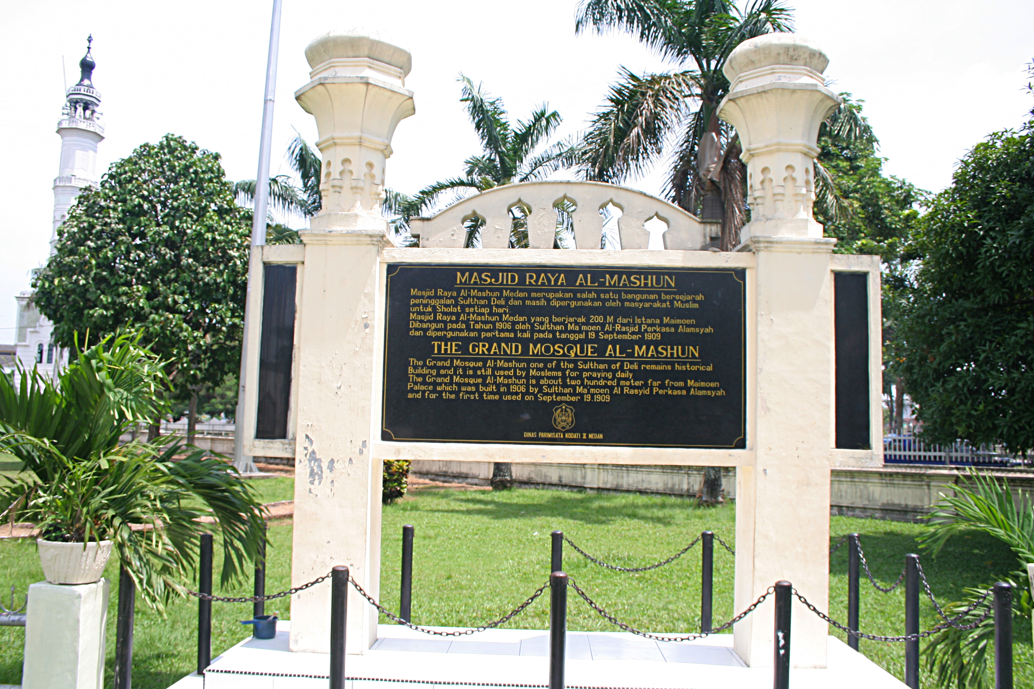 Placa de construcción de Mezquita Al Mashun, Medan, Sumatra, Indonesia