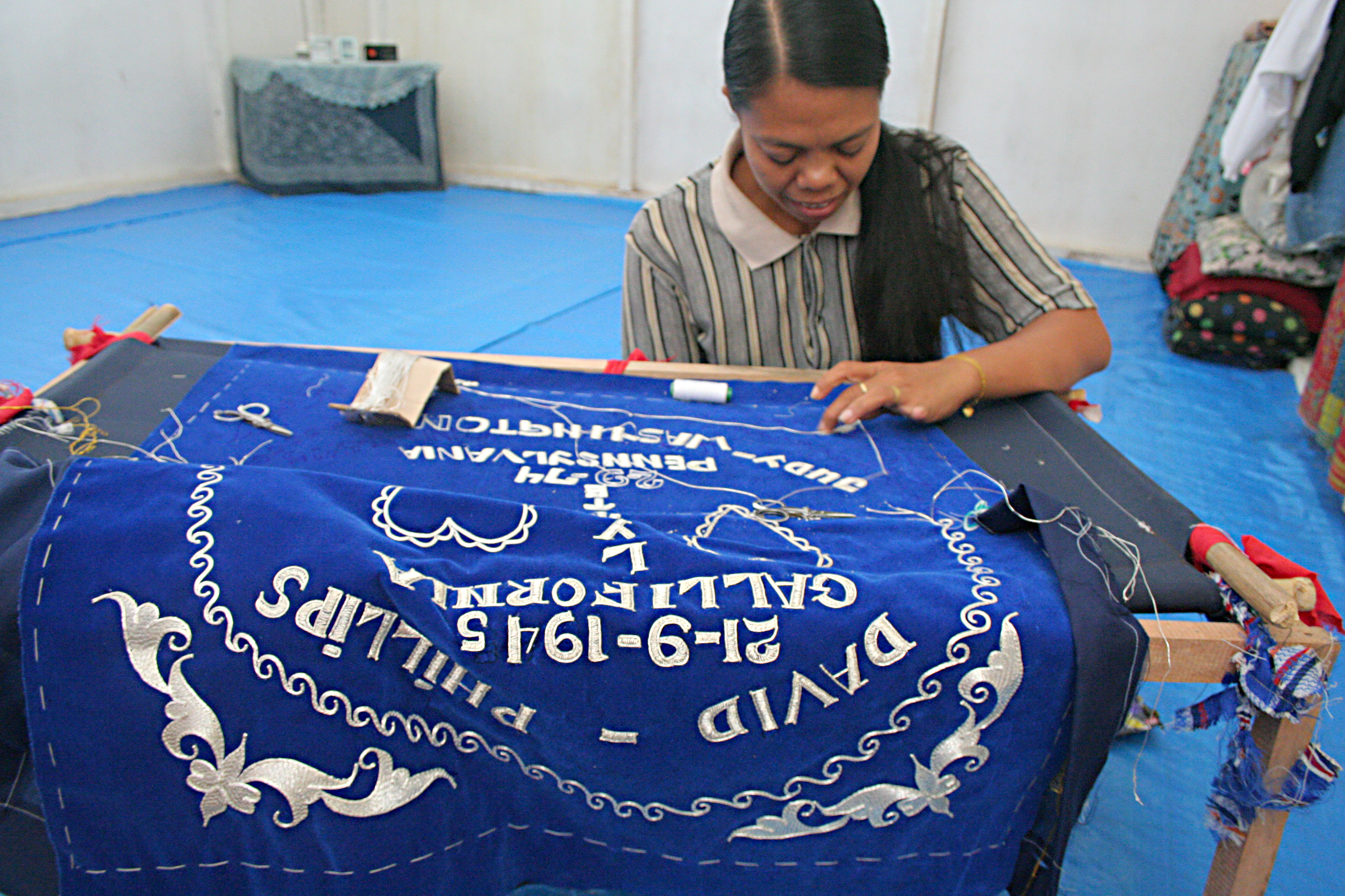 Bordando en el campo de refugiados de Melaboh, Sumatra, Indonesia