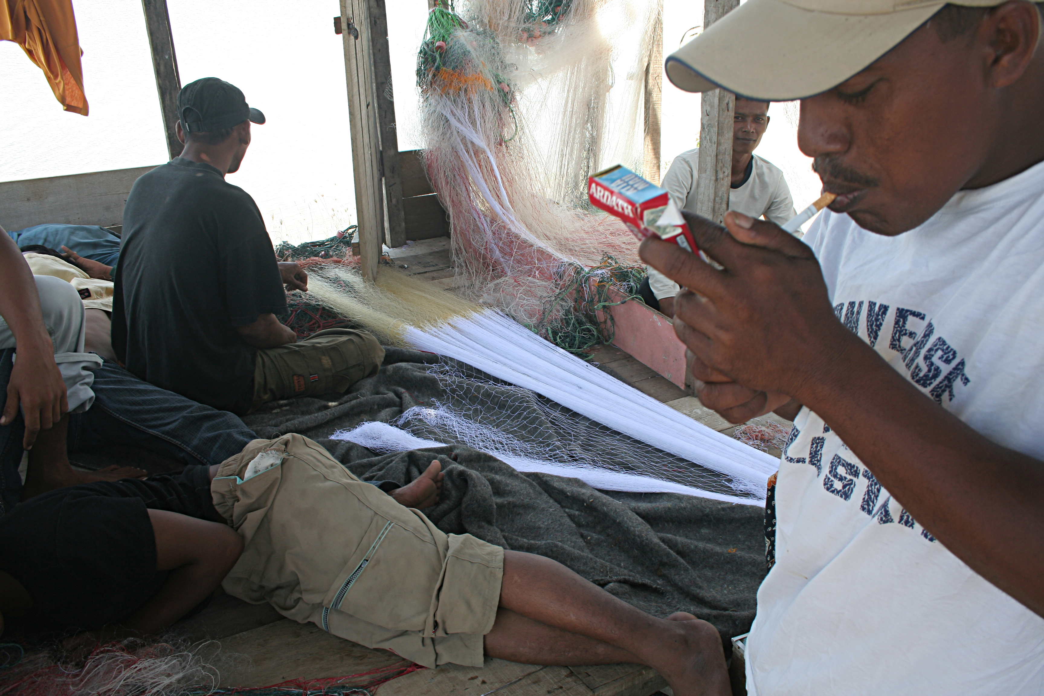 Arreglando redes del campamento de pescado de Alunaga, Sumatra, Indonesia