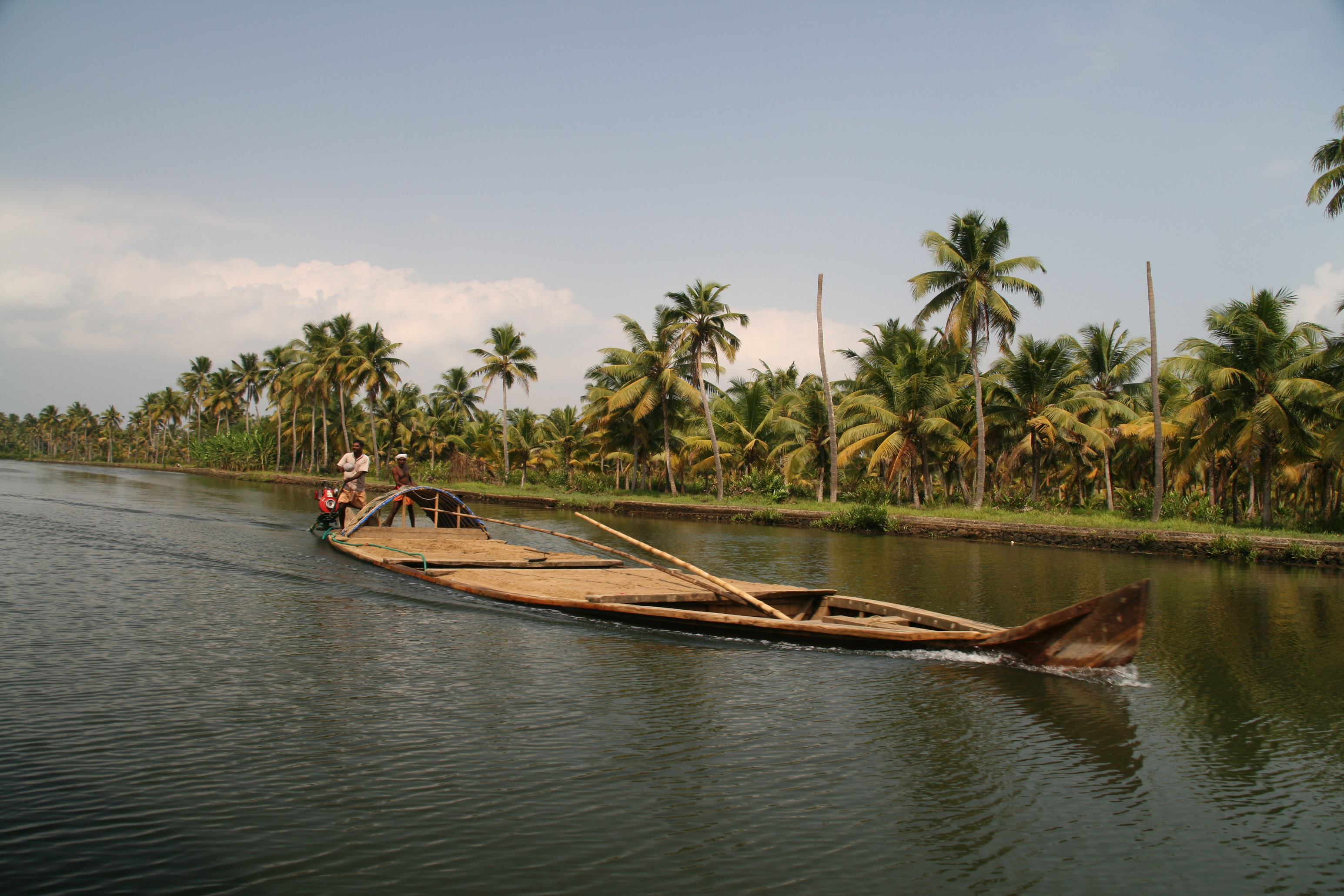 Embarcación de transporte de mercancías en los backwaters, Kerala, India
