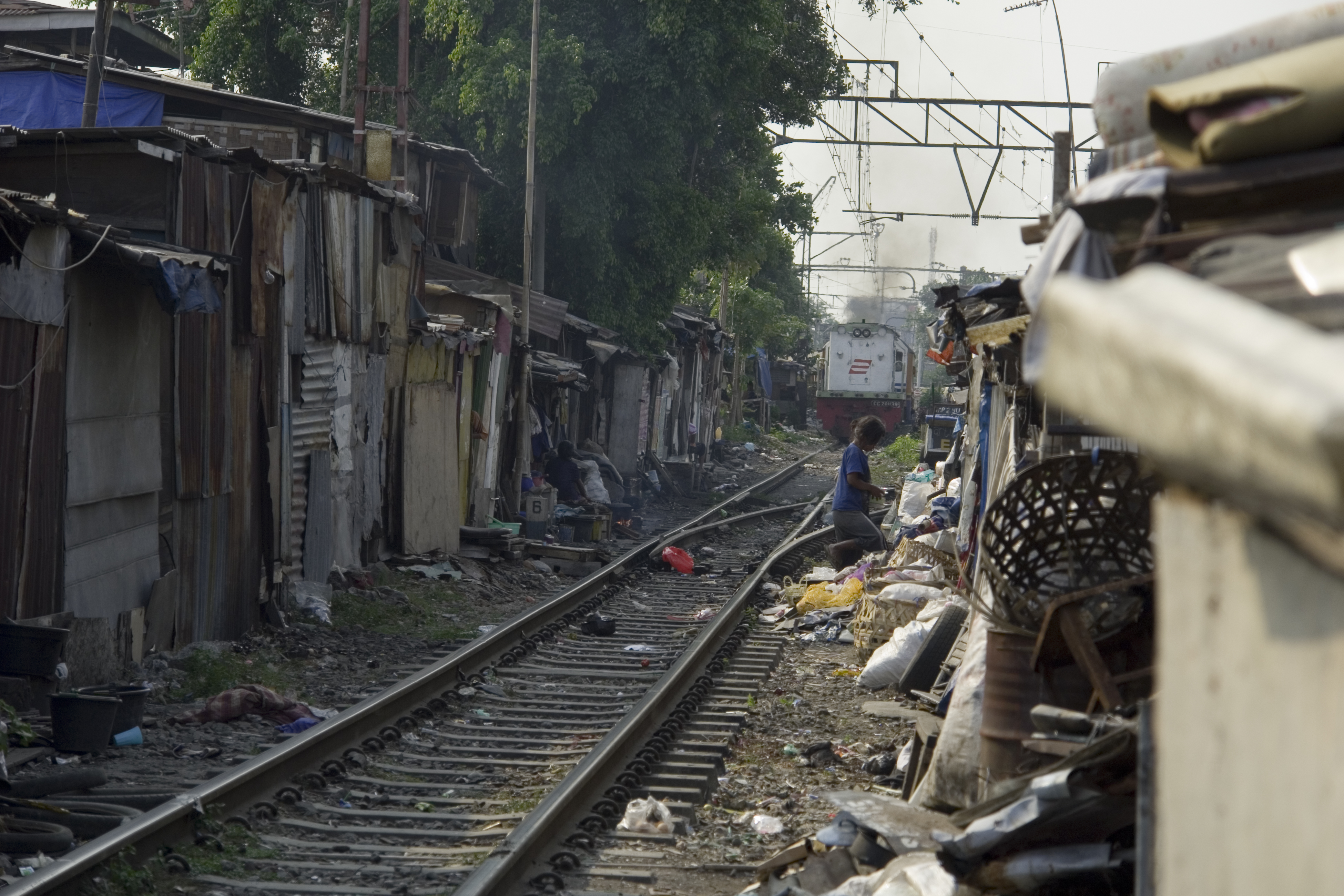 Tren pasando junto a chabolas entre las estaciones de Senen y Kota en Yakarta, Indonesia