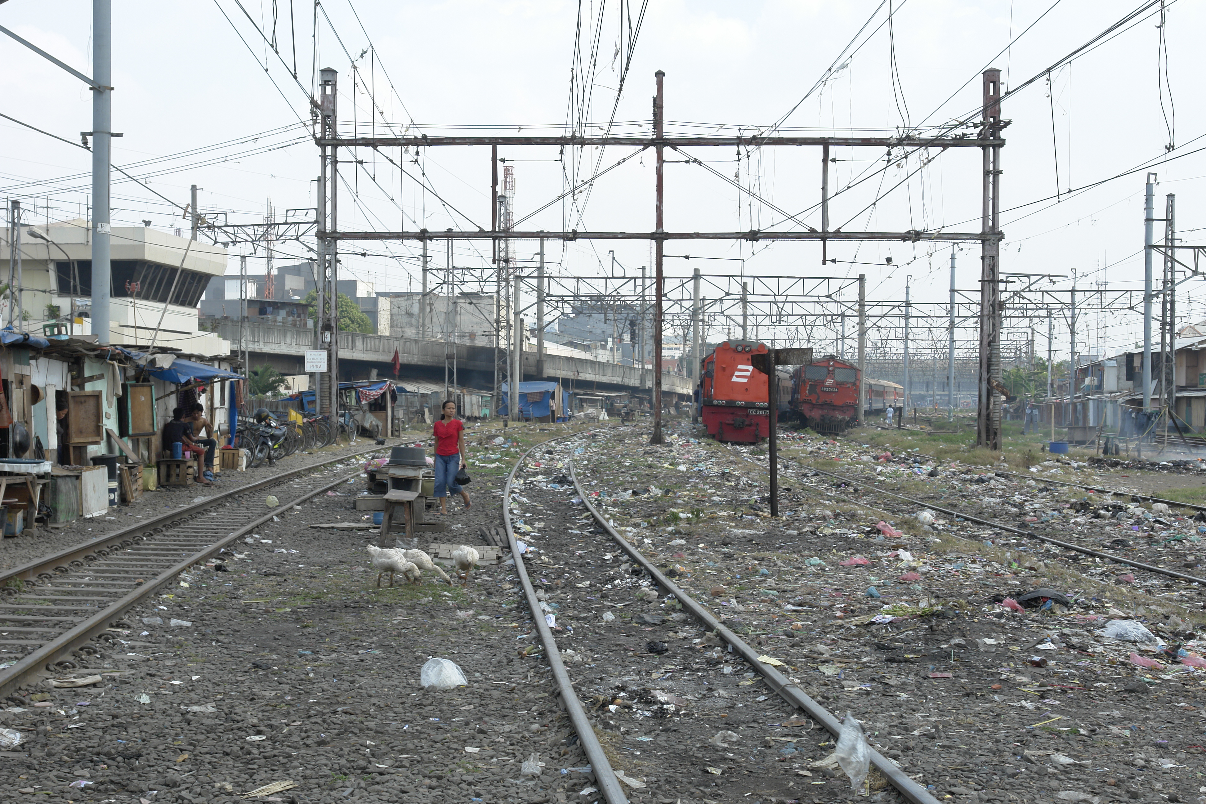 Vías y tren en Mangadua, Yakarta, Indonesia