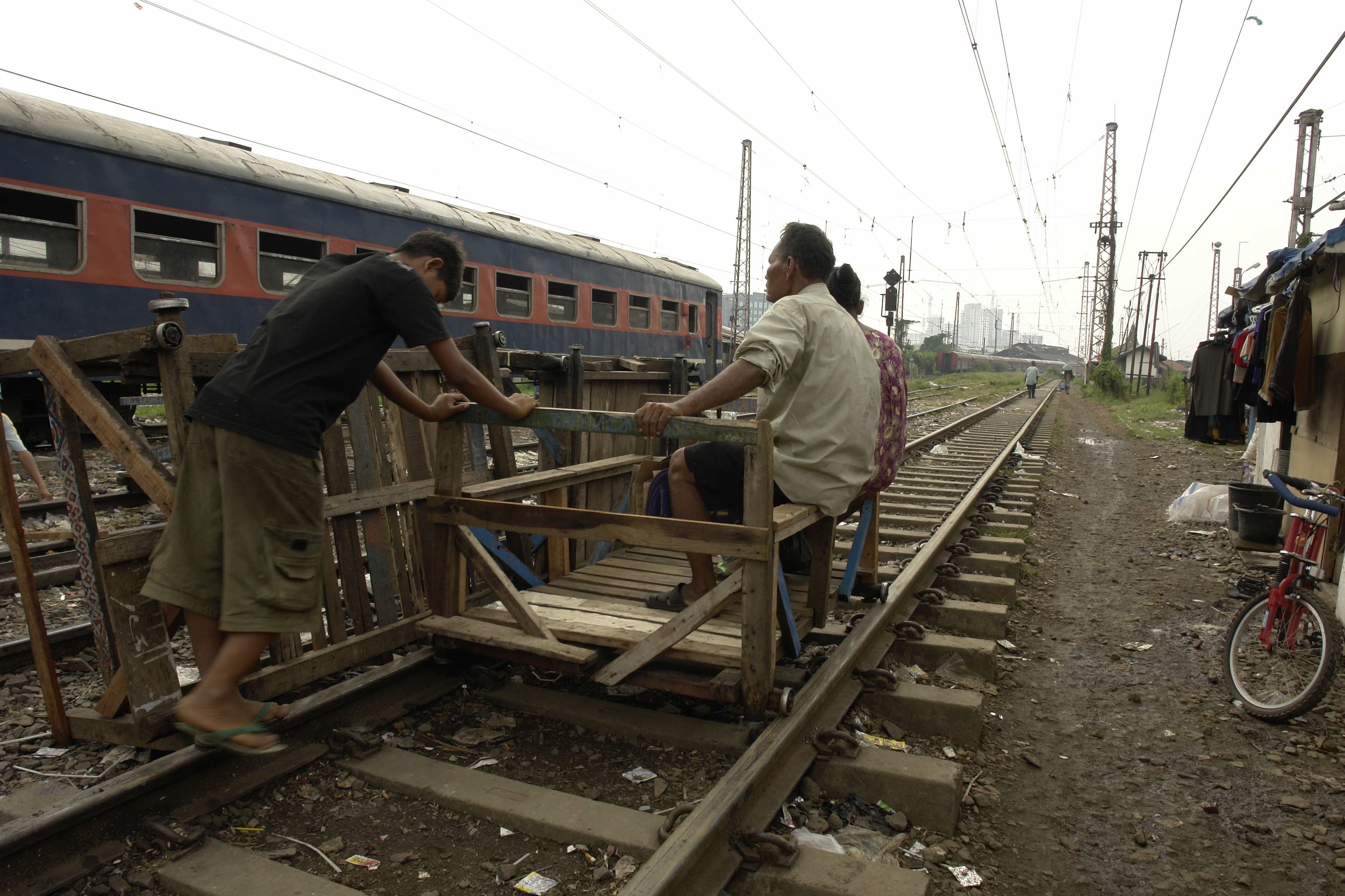 Transportándose por las vías en el barrio de Mangadua, Yakarta, Indonesia