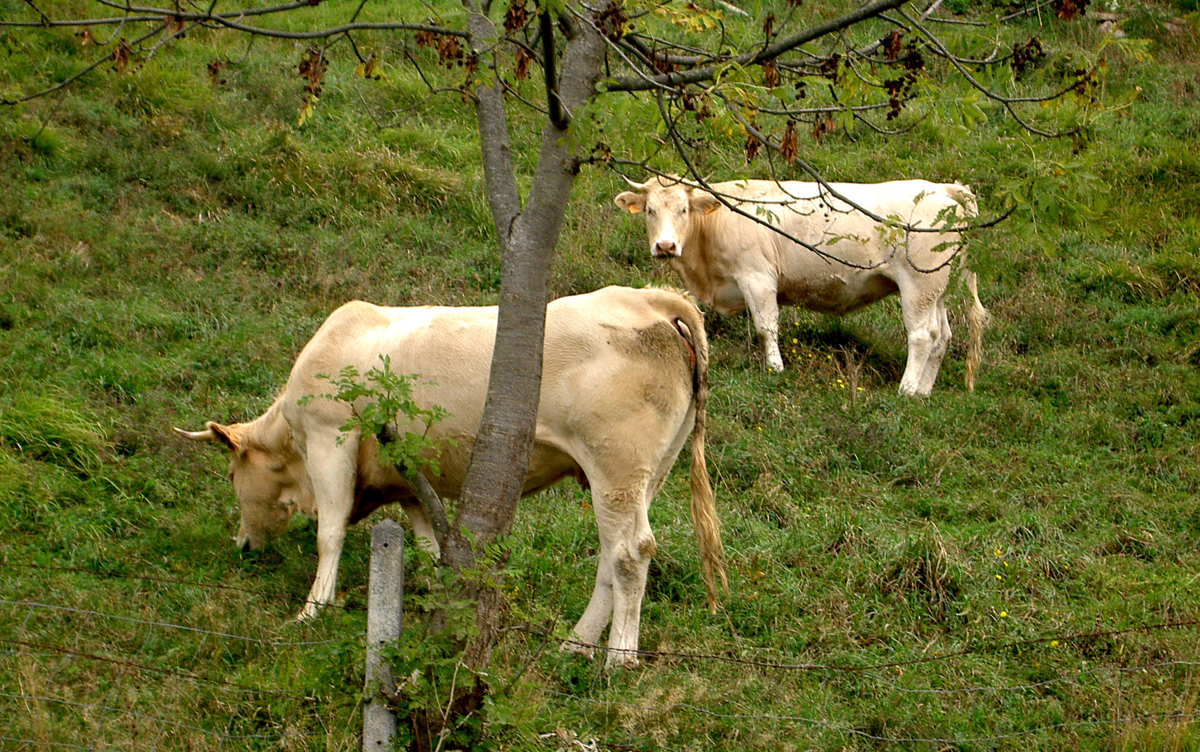 Vacas pastando y comiendo en un bosque en los Pirineos, Francia