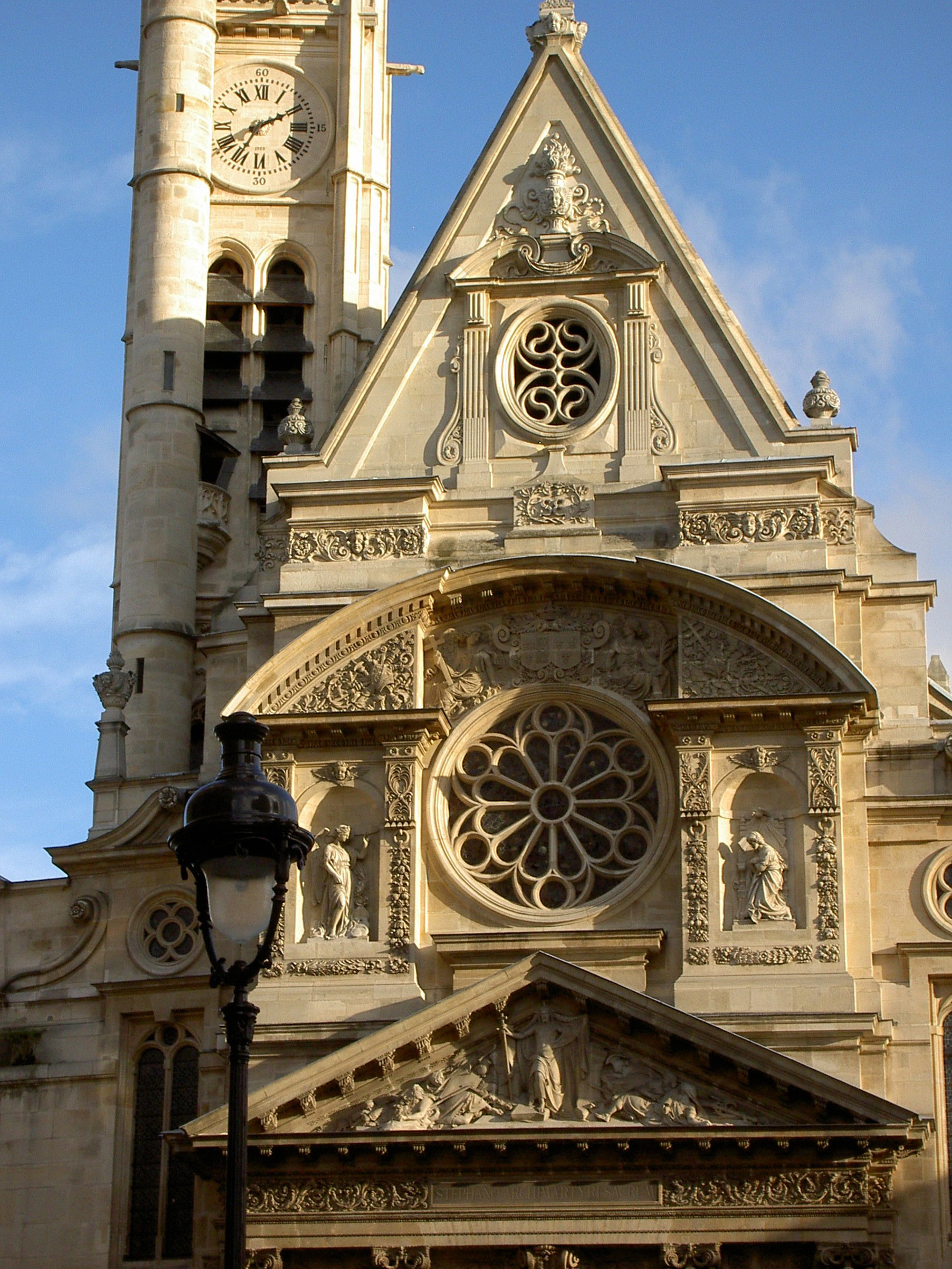 Fachada de la iglesia de Saint-Étienne-du-Mont o San Esteban del Monte en París, Francia. Presenta una mezcla de elementos góticos, barrocos y renacentistas, mediante una triple sucesión de frontones de distintos tipos.