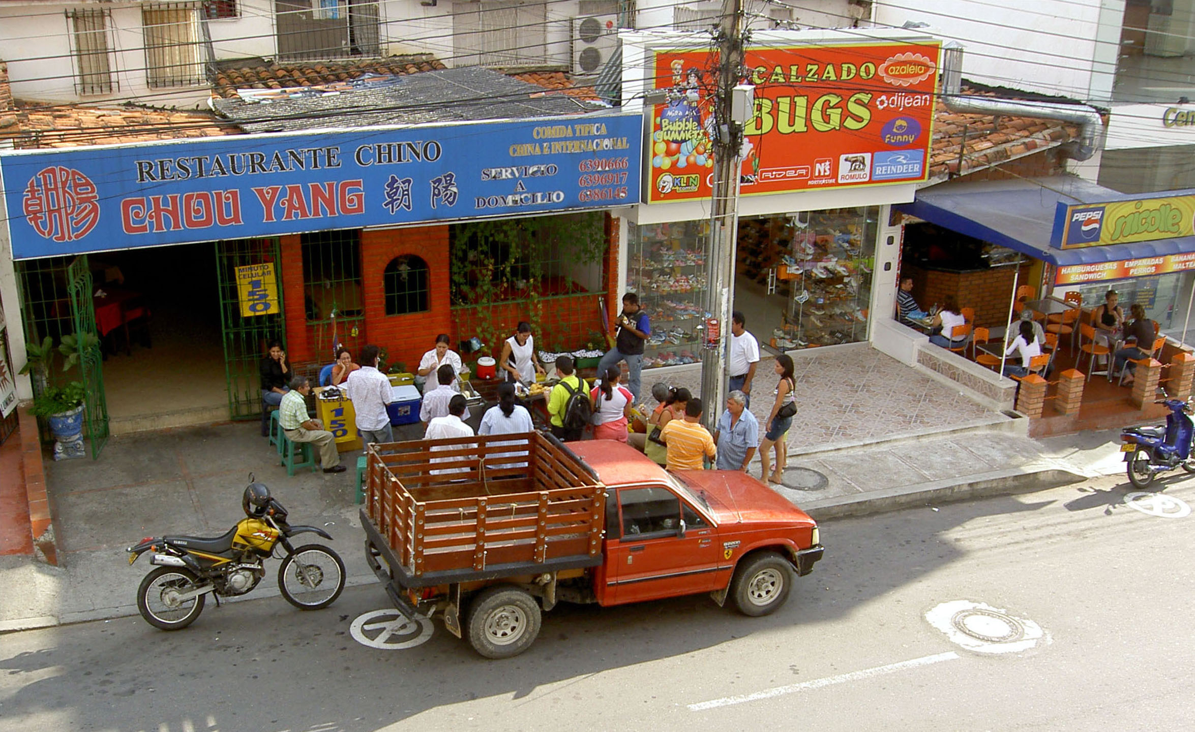 Calle del municipio colombiano de Bucaramanga, Santander. Vista de gente en la calle, restaurante chino, tienda de calzado y vehículos aparcados.