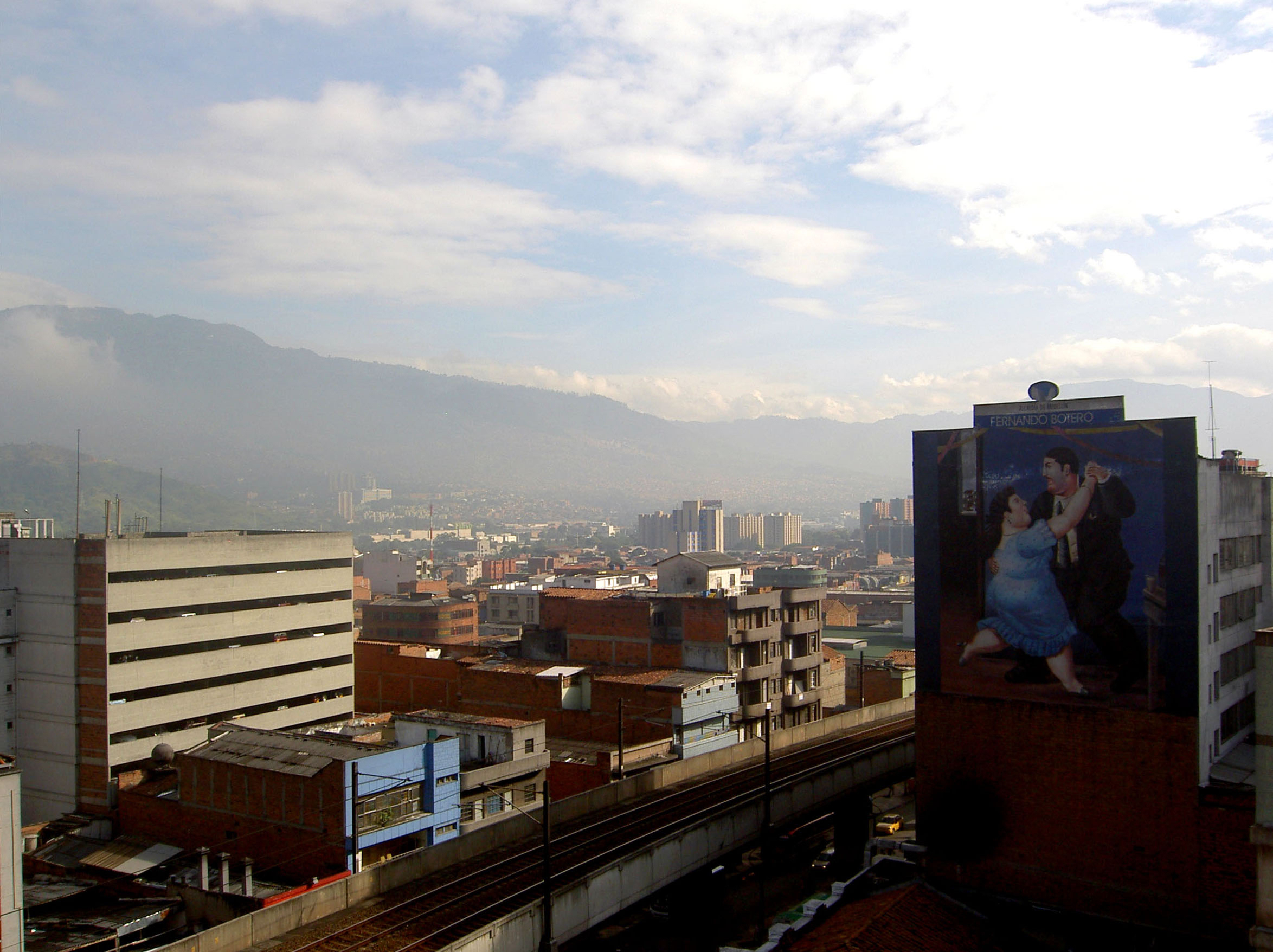 Vistas de la pintura mural El Tango de Fernando Botero, viviendas y vías del metro de Medellín, Colombia.