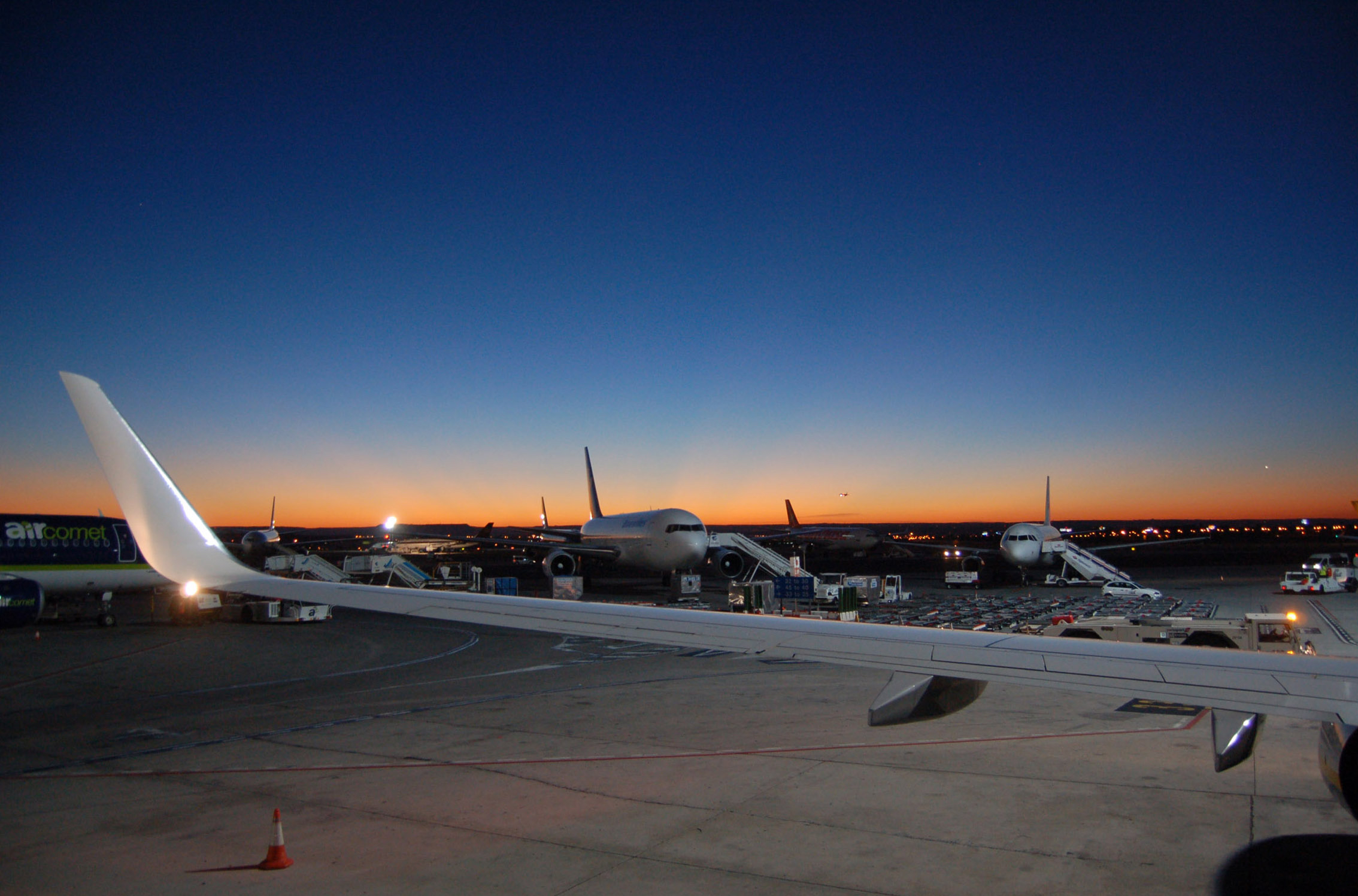 Vista del amanecer y aviones en la pista del Aeropuerto Adolfo Suárez Madrid Barajas de Madrid, España.