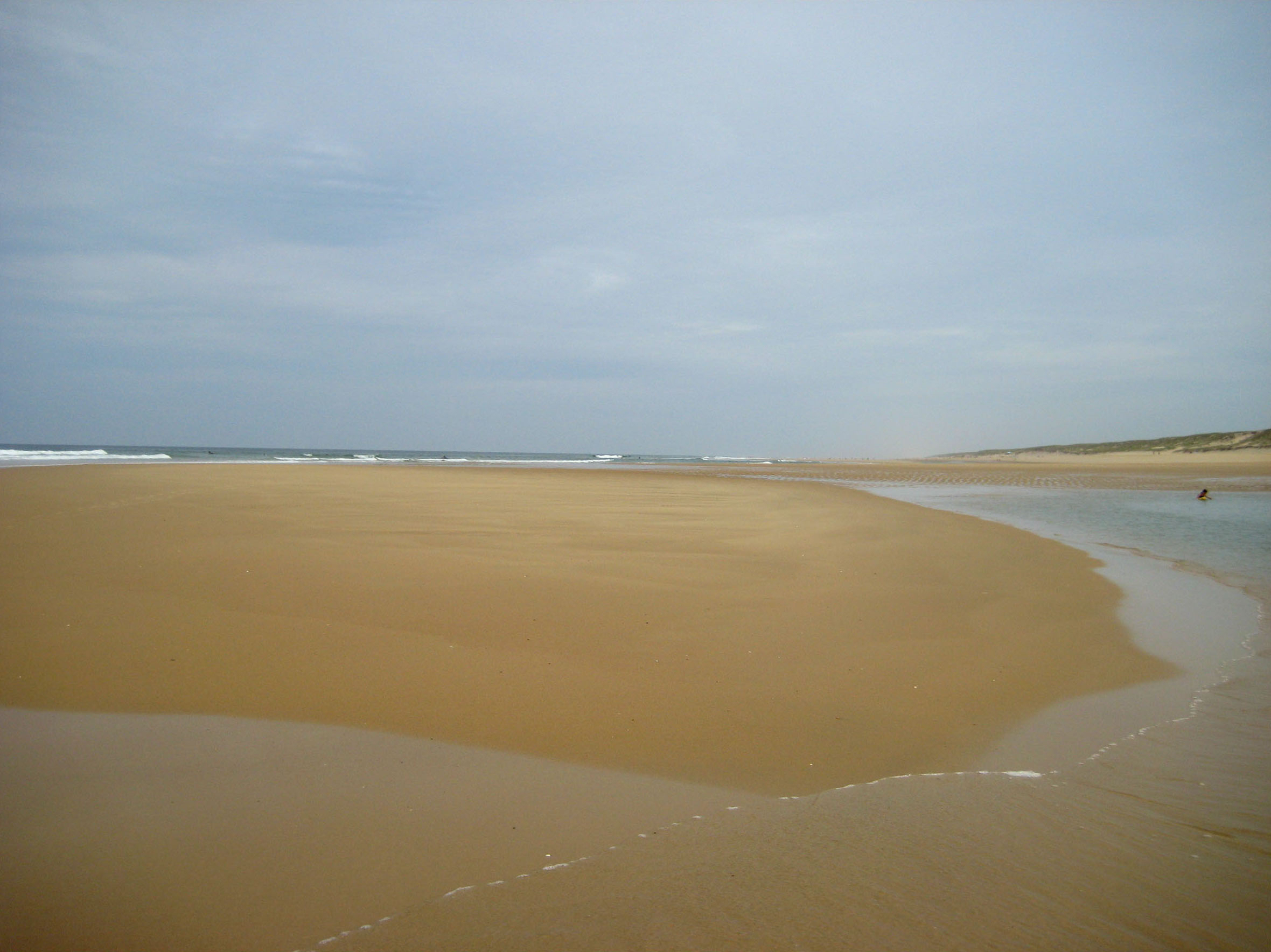 Playa del cabo Ferret de la costa atlántica de Francia, con el mar, arena y el cielo nublado y gris
