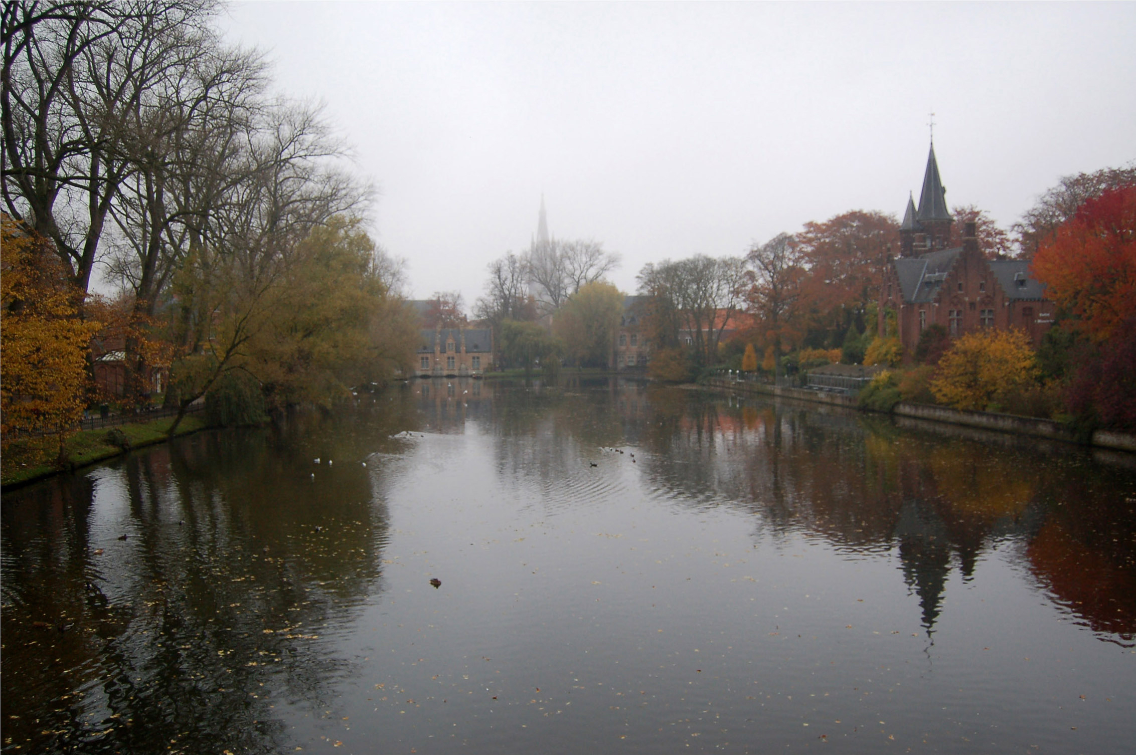 Lago Minnewater o Lago del amor en Brujas. Vista del lago, viviendas y vegetación.