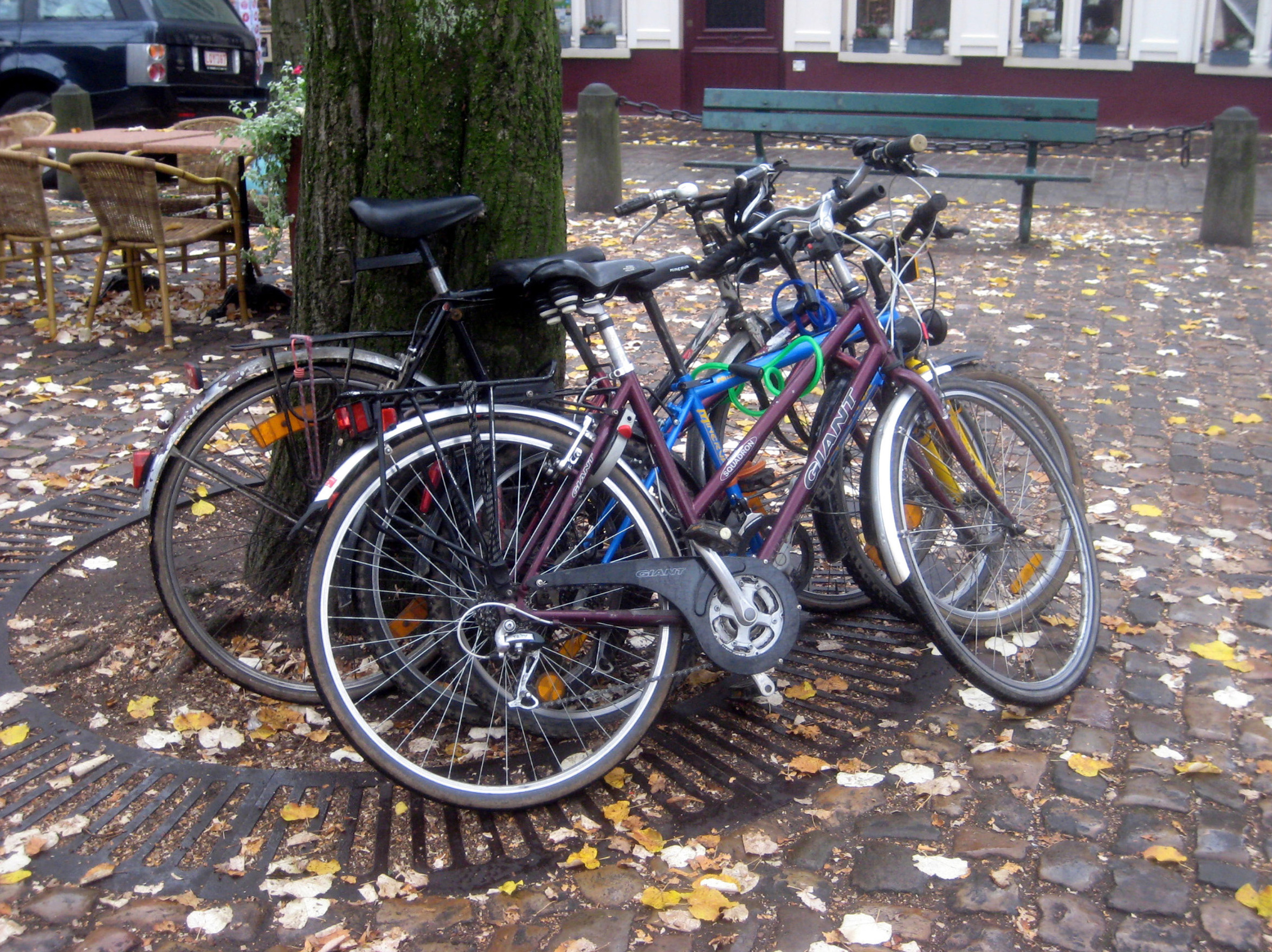 Bicicletas aparcadas junto a un árbol en Brujas.