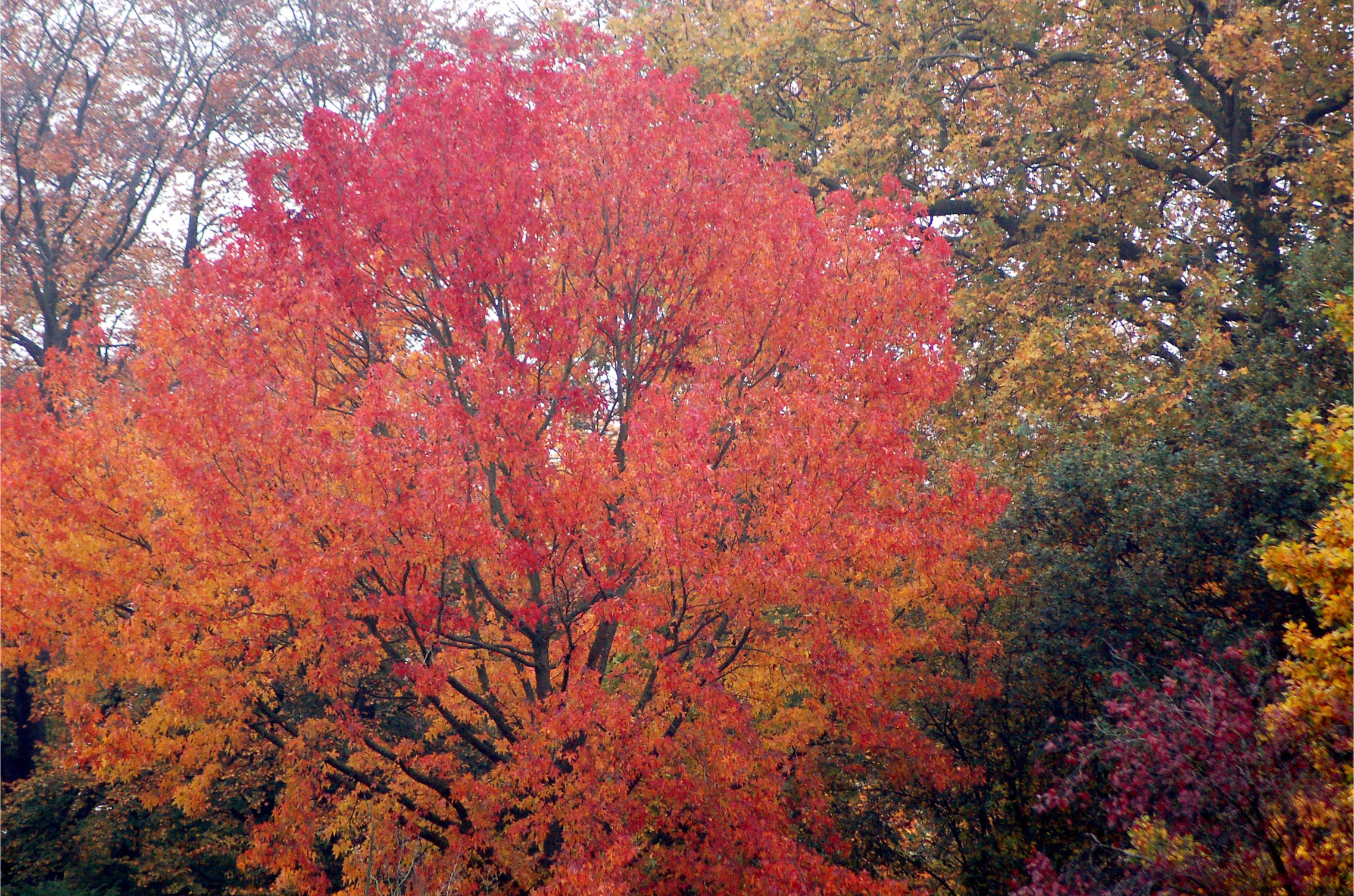 Copas de árboles en Brujas. Vista de las ramas y las hojas con colores otoñales.