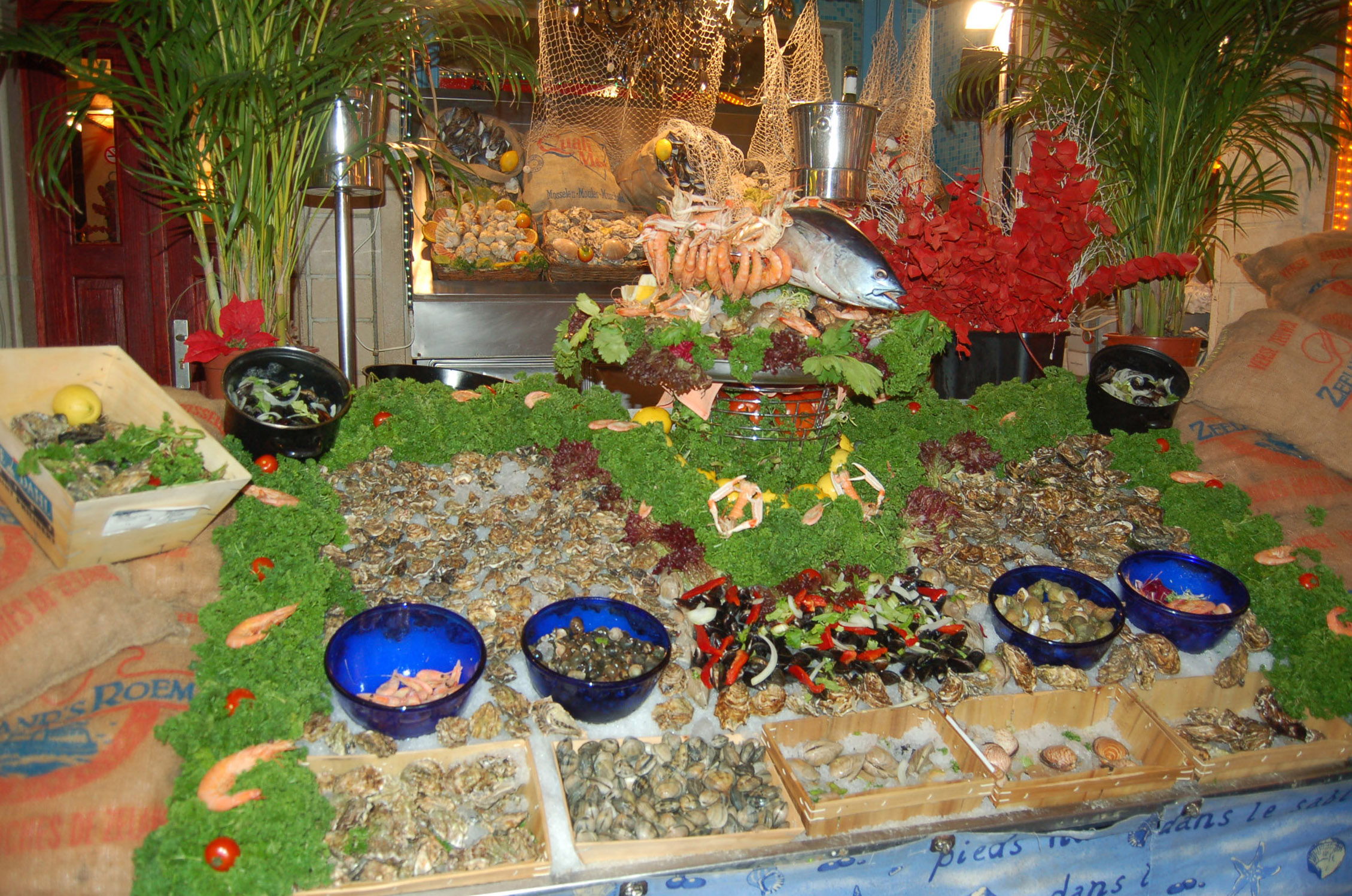 Puesto de mariscos y cervezas en el mercado de Bruselas, Bélgica.