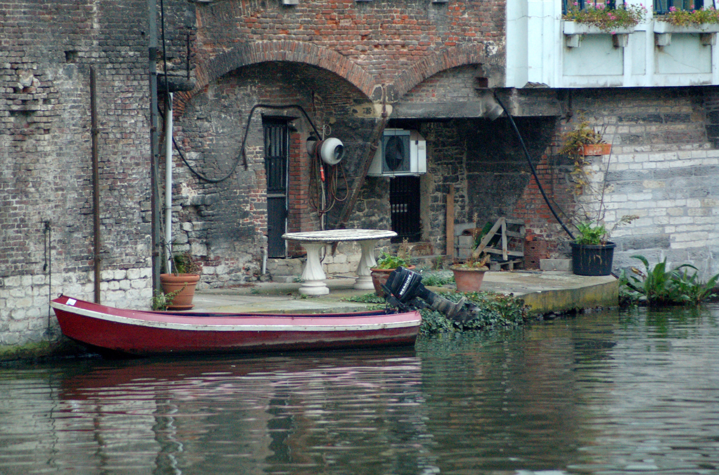 Vista de una barca junto a una casa en el canal de Gante, Bélgica.