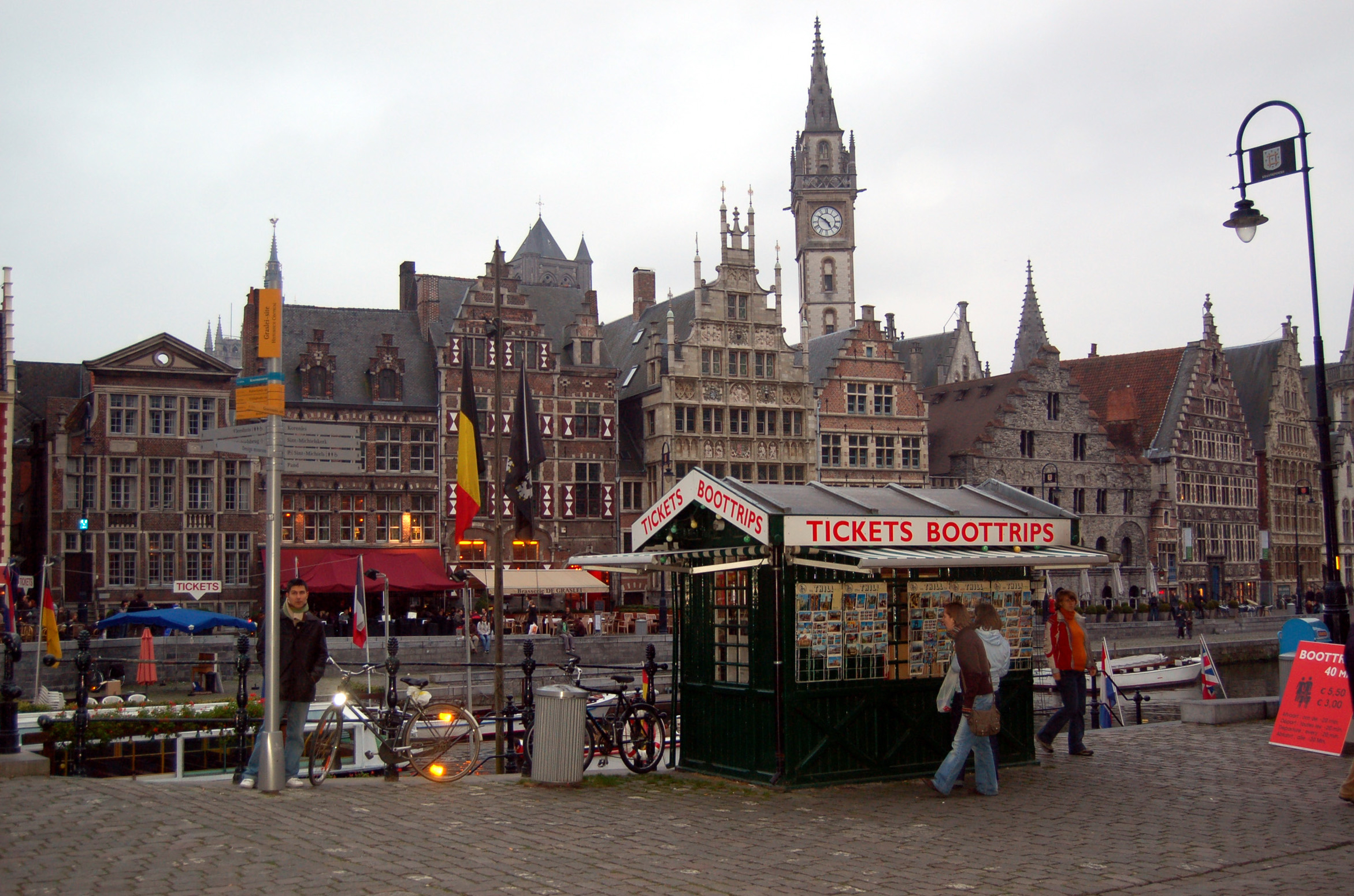 Fachadas de Casas Gremiales, edificios y caseta de venta de billetes o tickets de viaje en barco por el canal de Gante, Bélgica.