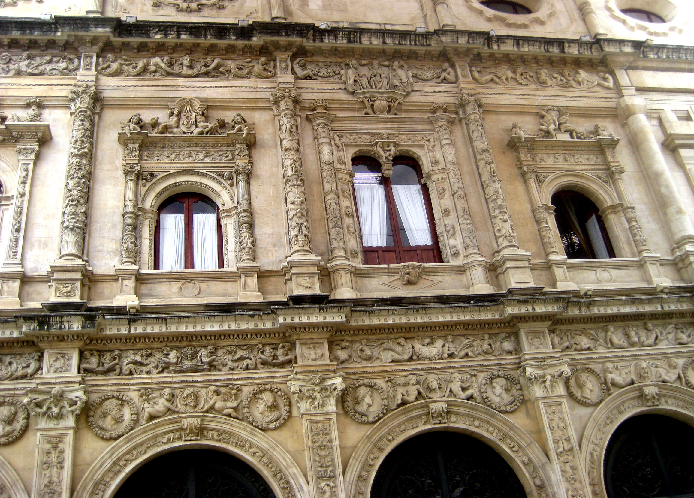 Fachada del Ayuntamiento de Sevilla con ventanales y decoraciones platerescas