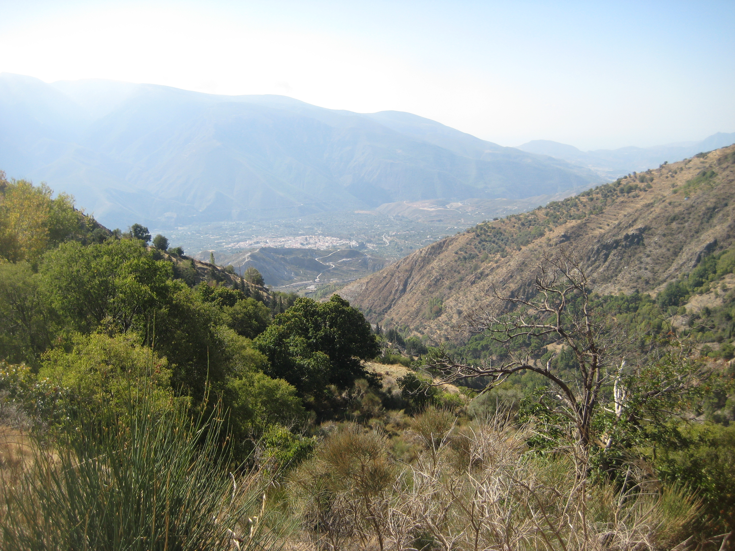 Paisaje de la Alpujarra. La región consiste principalmente en una serie de valles y barrancos que descienden desde las cumbres de Sierra Nevada, en el norte, al eje vertebrador de la comarca, que es el gran valle, dispuesto en dirección este-oeste, formado por las cuencas del río Guadalfeo, en la parte granadina, y del río Andarax, en la parte almeriense. Al sur, la Sierra de Lújar, la Sierra de la Contraviesa y la Sierra de Gádor con sus barrancos, que descienden desde estas sierras al mar Mediterráneo.
