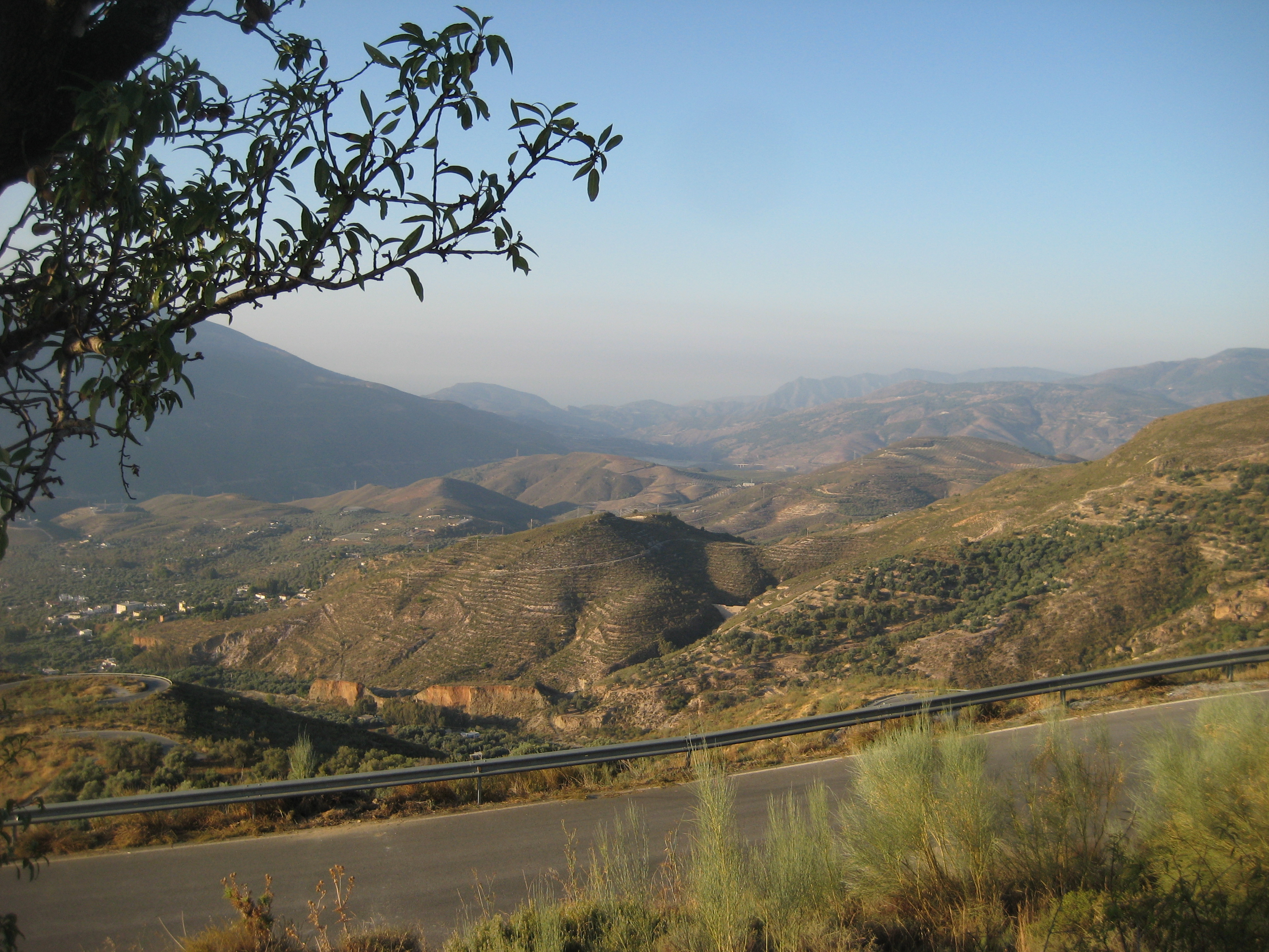 Paisaje de la Alpujarra. La región consiste principalmente en una serie de valles y barrancos que descienden desde las cumbres de Sierra Nevada, en el norte, al eje vertebrador de la comarca, que es el gran valle, dispuesto en dirección este-oeste, formado por las cuencas del río Guadalfeo, en la parte granadina, y del río Andarax, en la parte almeriense. Al sur, la Sierra de Lújar, la Sierra de la Contraviesa y la Sierra de Gádor con sus barrancos, que descienden desde estas sierras al mar Mediterráneo.