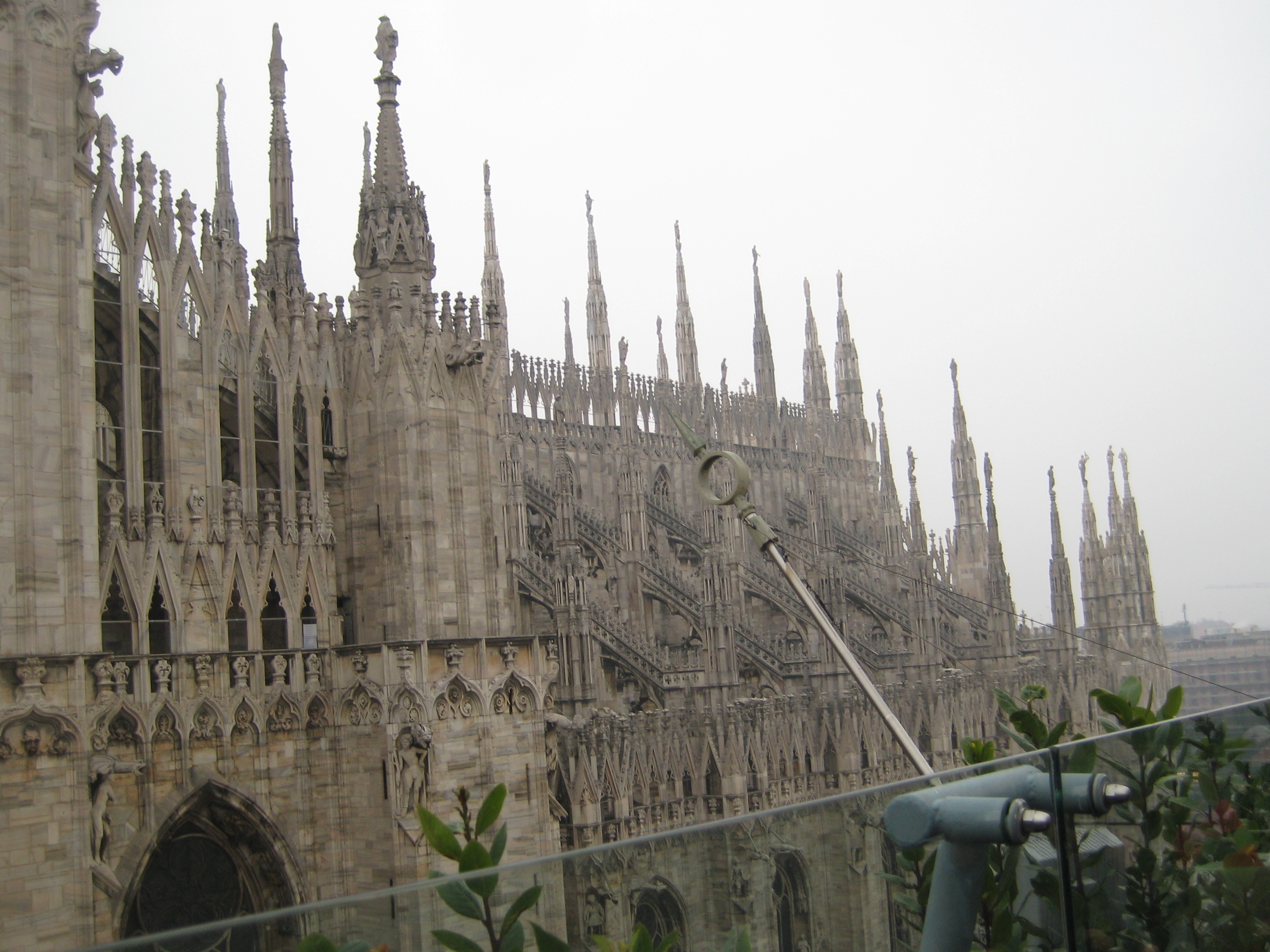 Fachada de la Catedral de Milán o Duomo di Milán. Vista arcos arbotantes, lateral derecho.