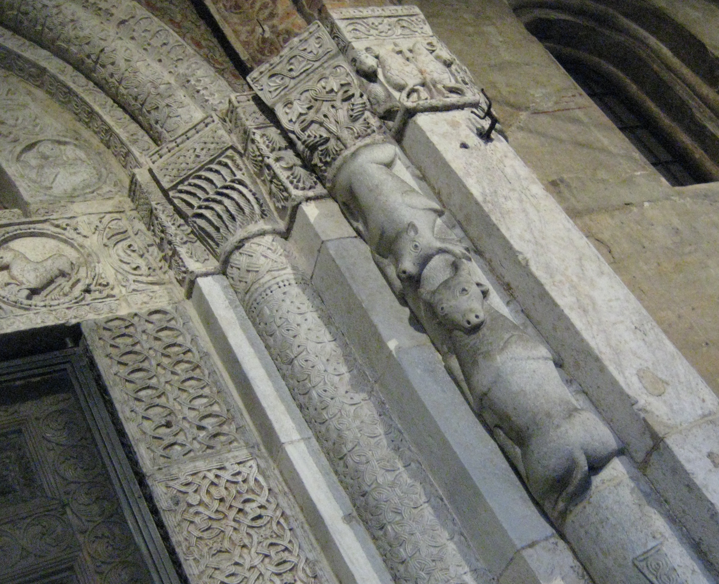 Detalle columnas situadas en el lateral de la puerta de entrada de la Basílica de San Ambrosio en Milán.