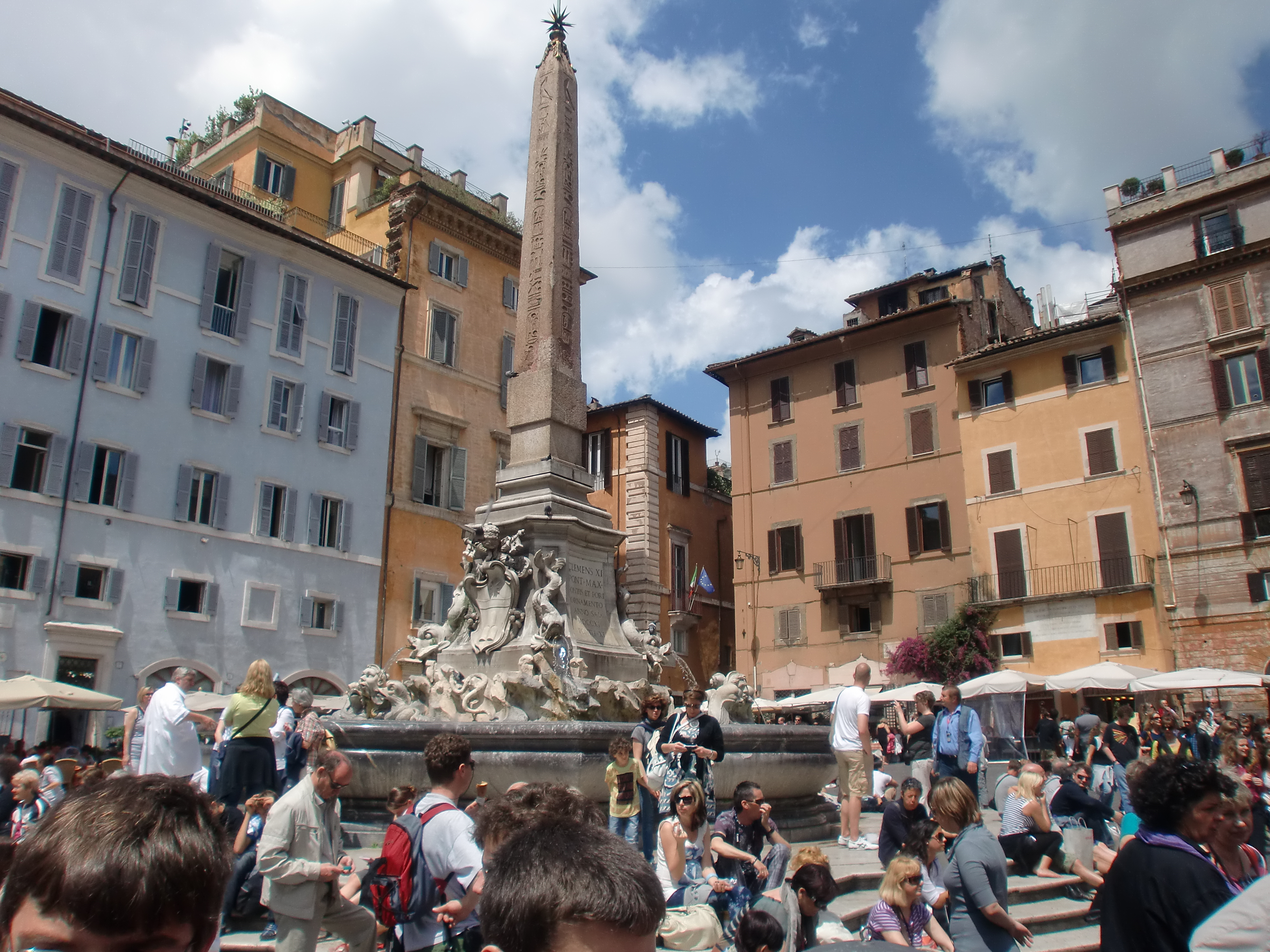 Vista del Obelisco Macuteo situado en la Plaza de la Rotonda frente al Panteón en Roma y turistas.