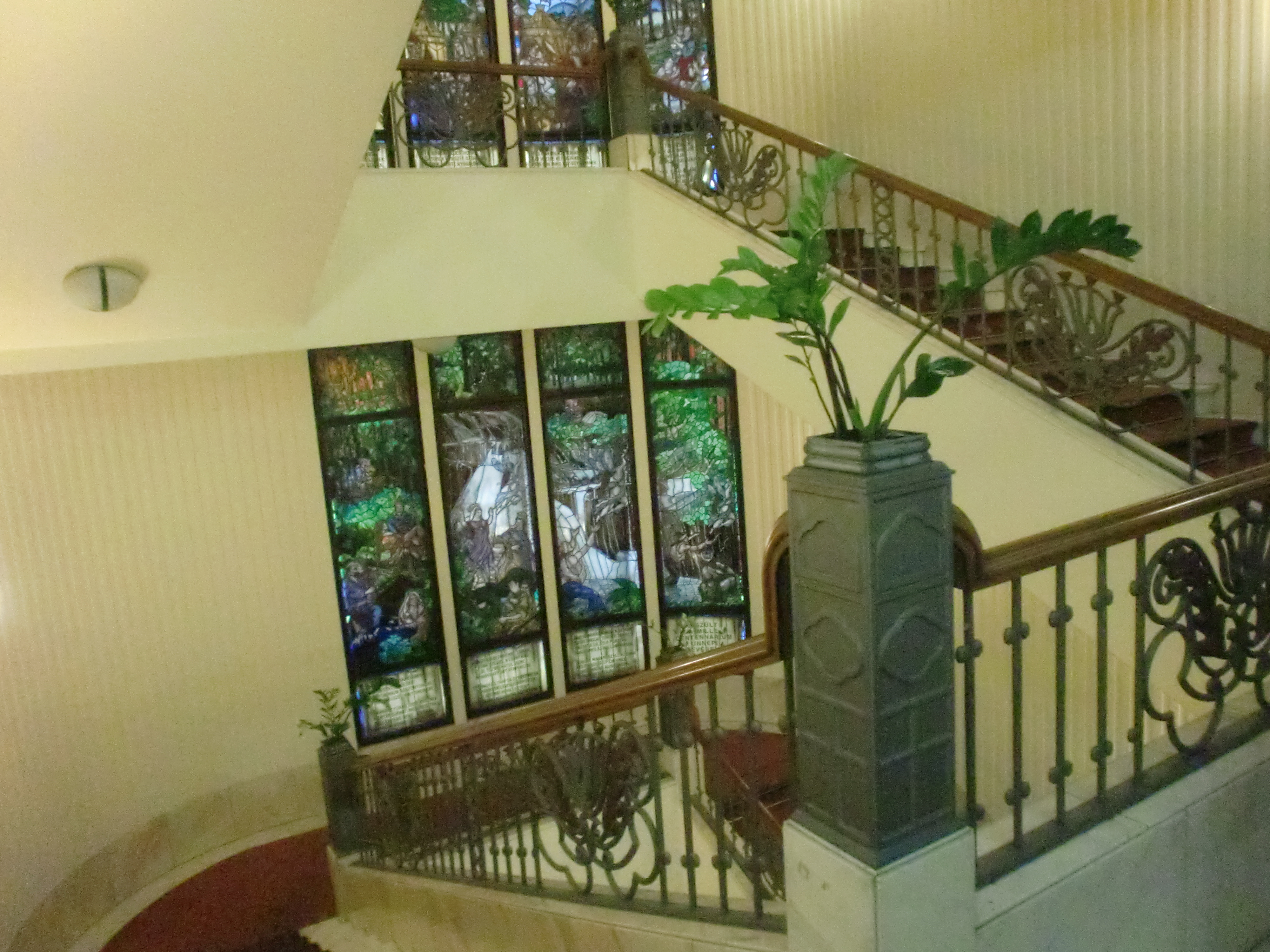 Escaleras y las vidrieras modernistas del Balneario Gellért, baños termales, en Budapest.