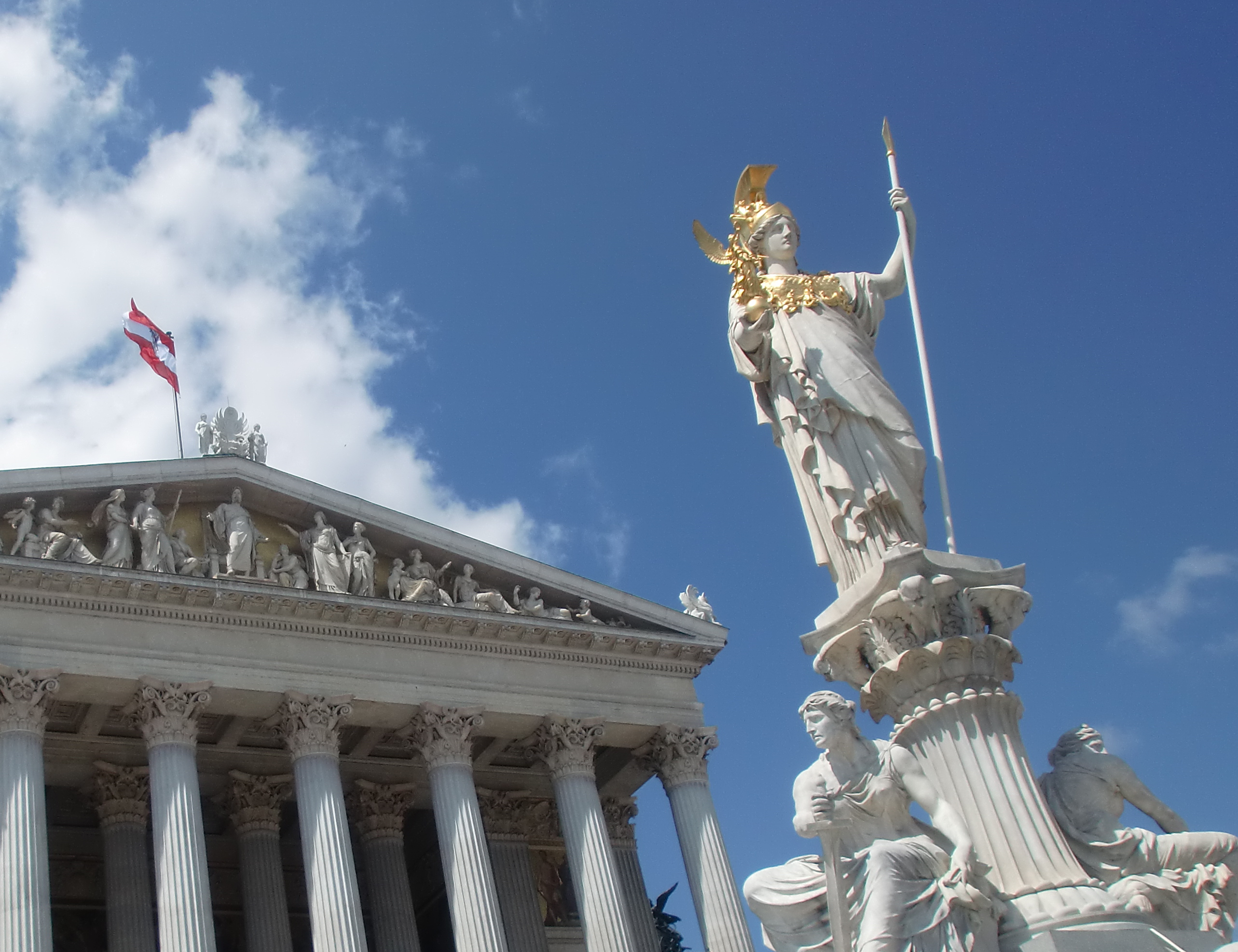 Vista parcial de la fachada del Parlamento Austriaco y parte superior de la fuente de Atenea en Viena.