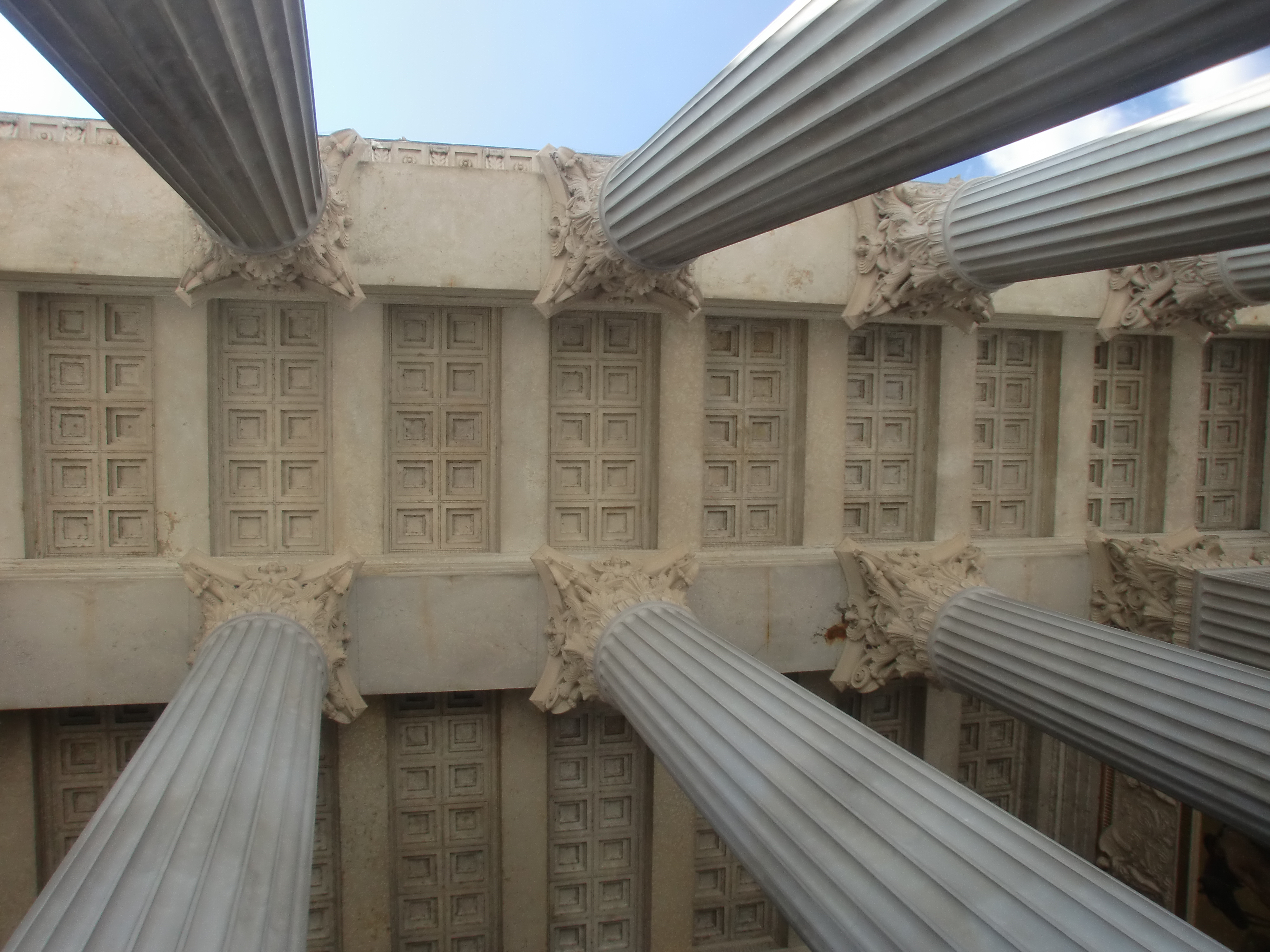 Plano contrapicado columnas y techo del exterior del Parlamento Austriaco en Viena.