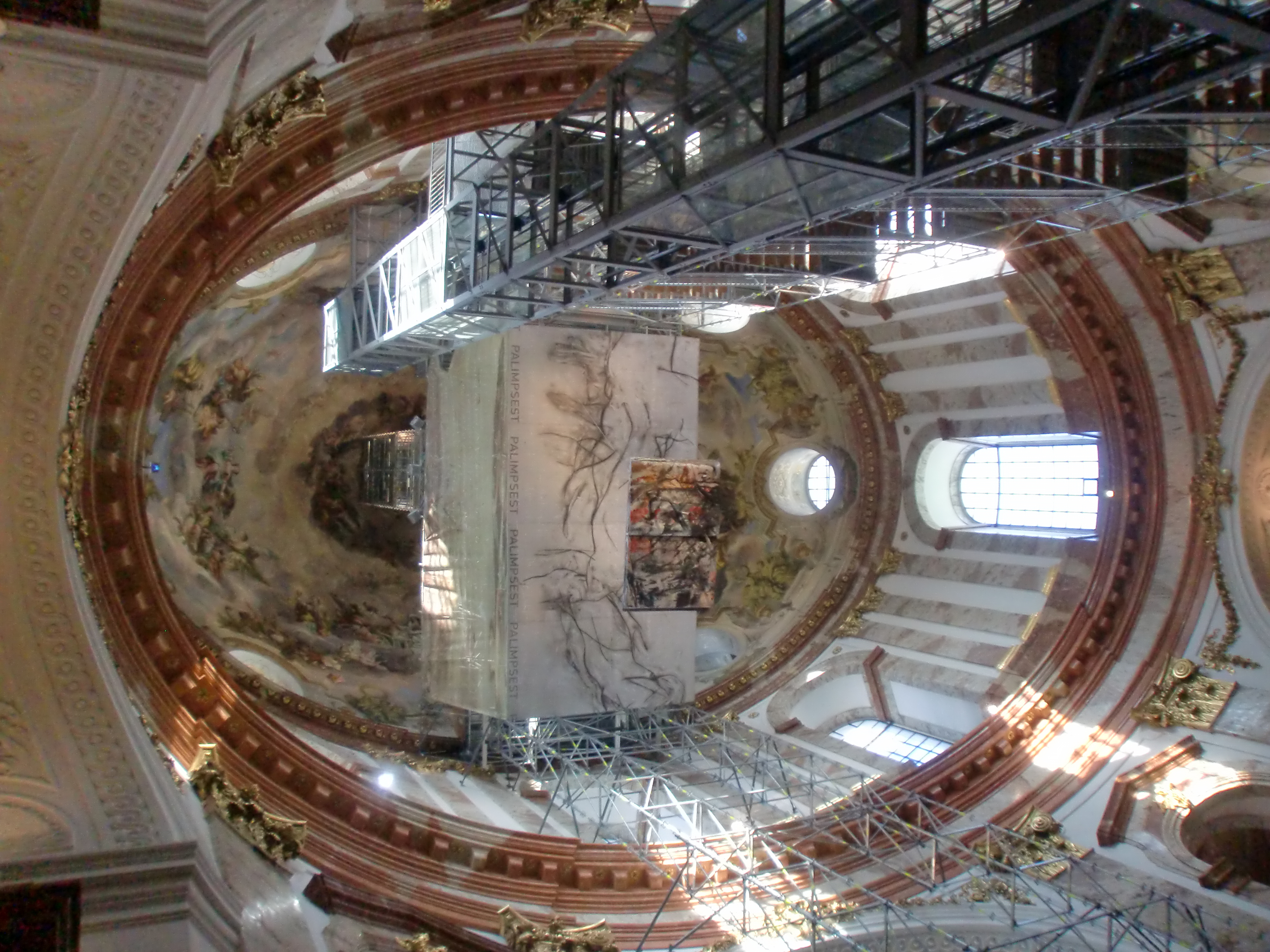 Interior de la Iglesia de San Carlos Borromeo en Viena. Plano contrapicado de la bóveda siendo restaurada.