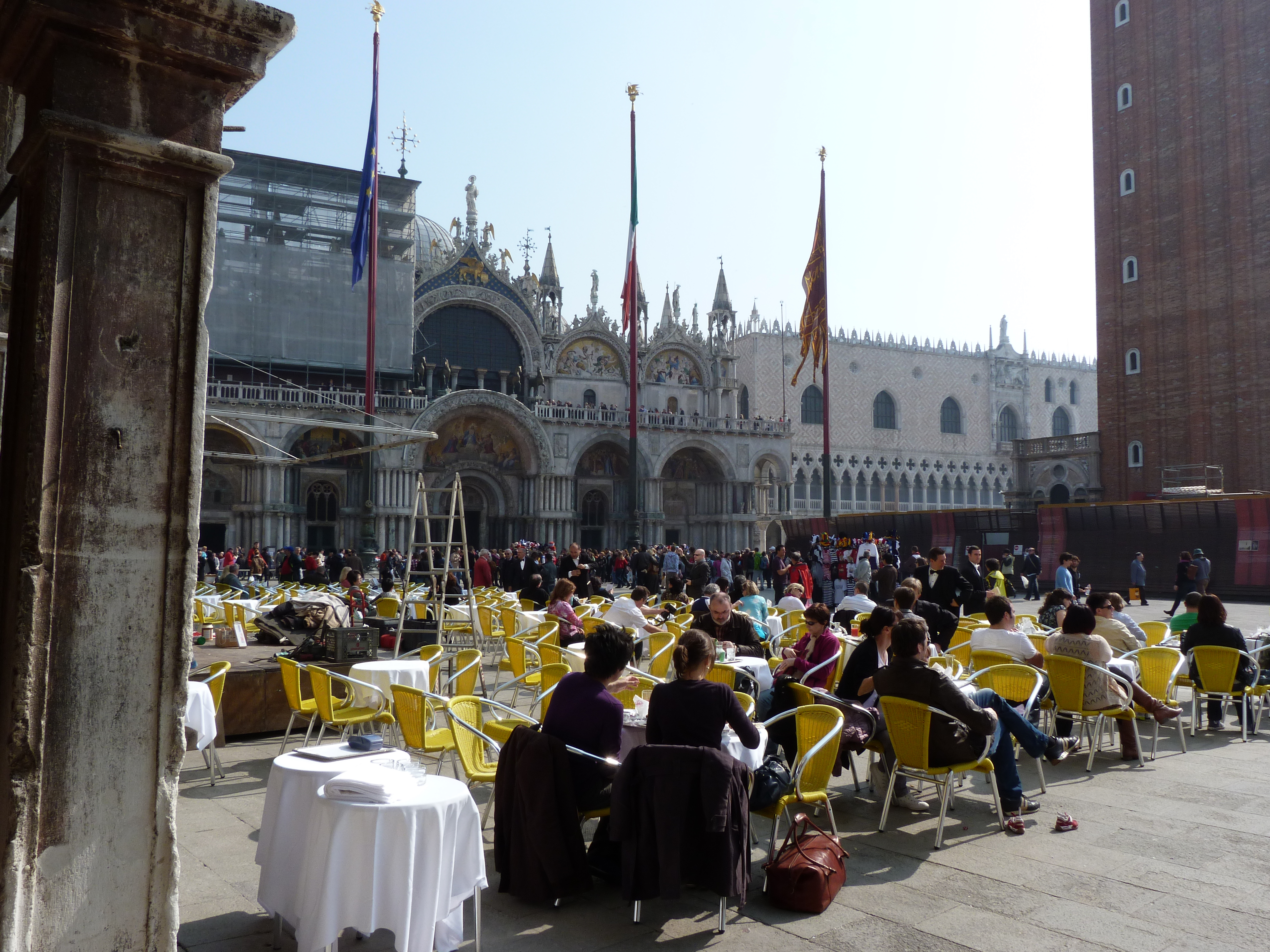 Plaza San Marcos, personas sentadas en la terraza de un restaurante