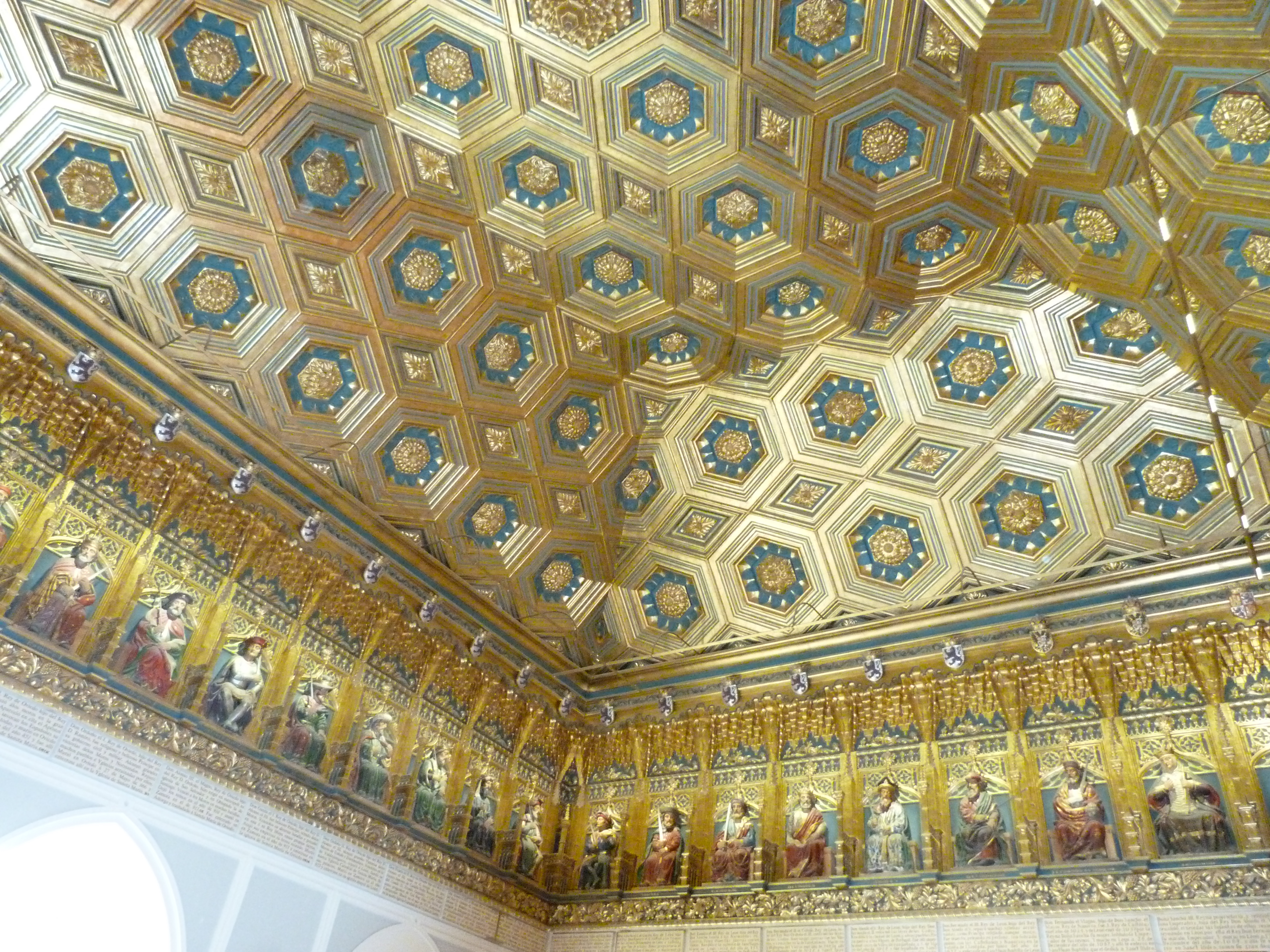 Artesonado policromado en el techo de una de las dependencias del alcázar de Segovia, concretamente en la sala de la genealogía de los reyes castellanos.