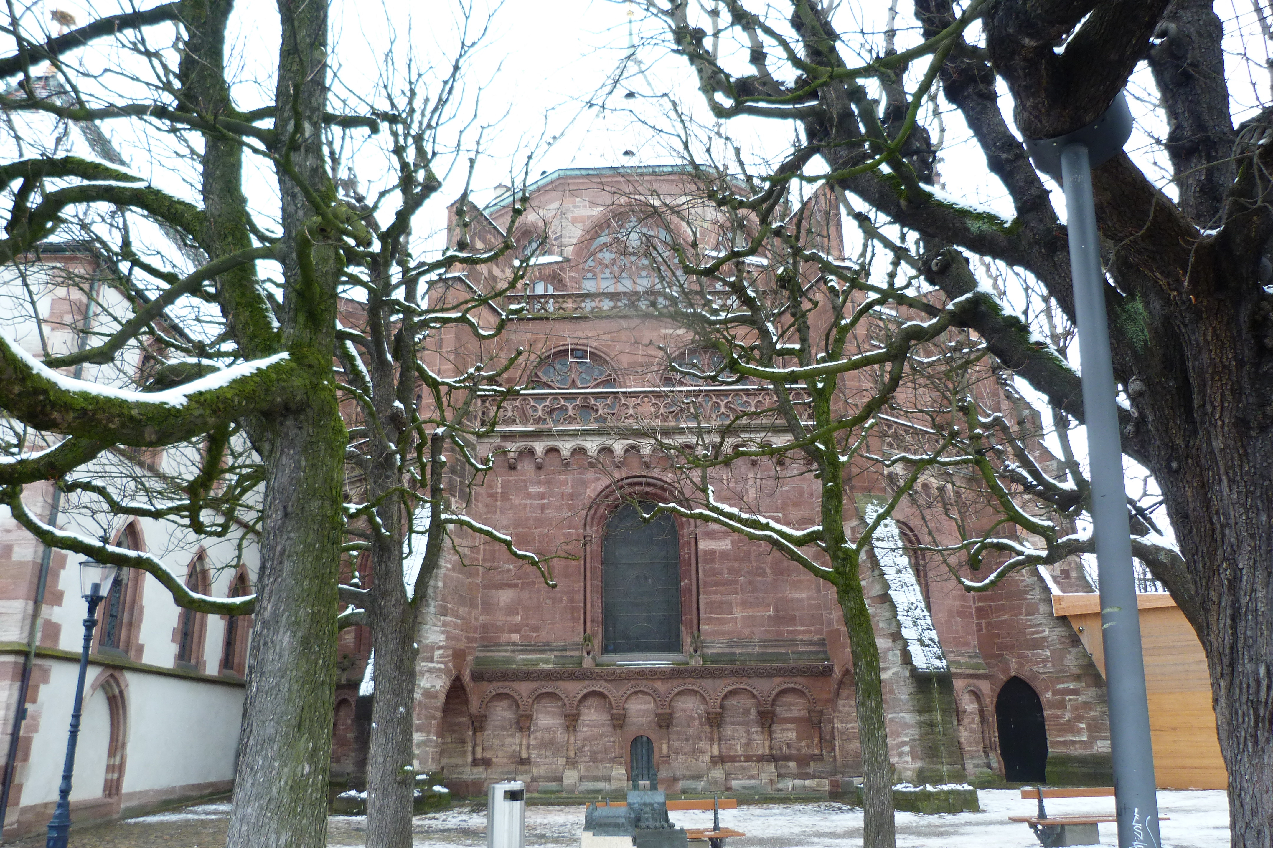 Exterior de la catedral de Basilea con un paisaje de nieve