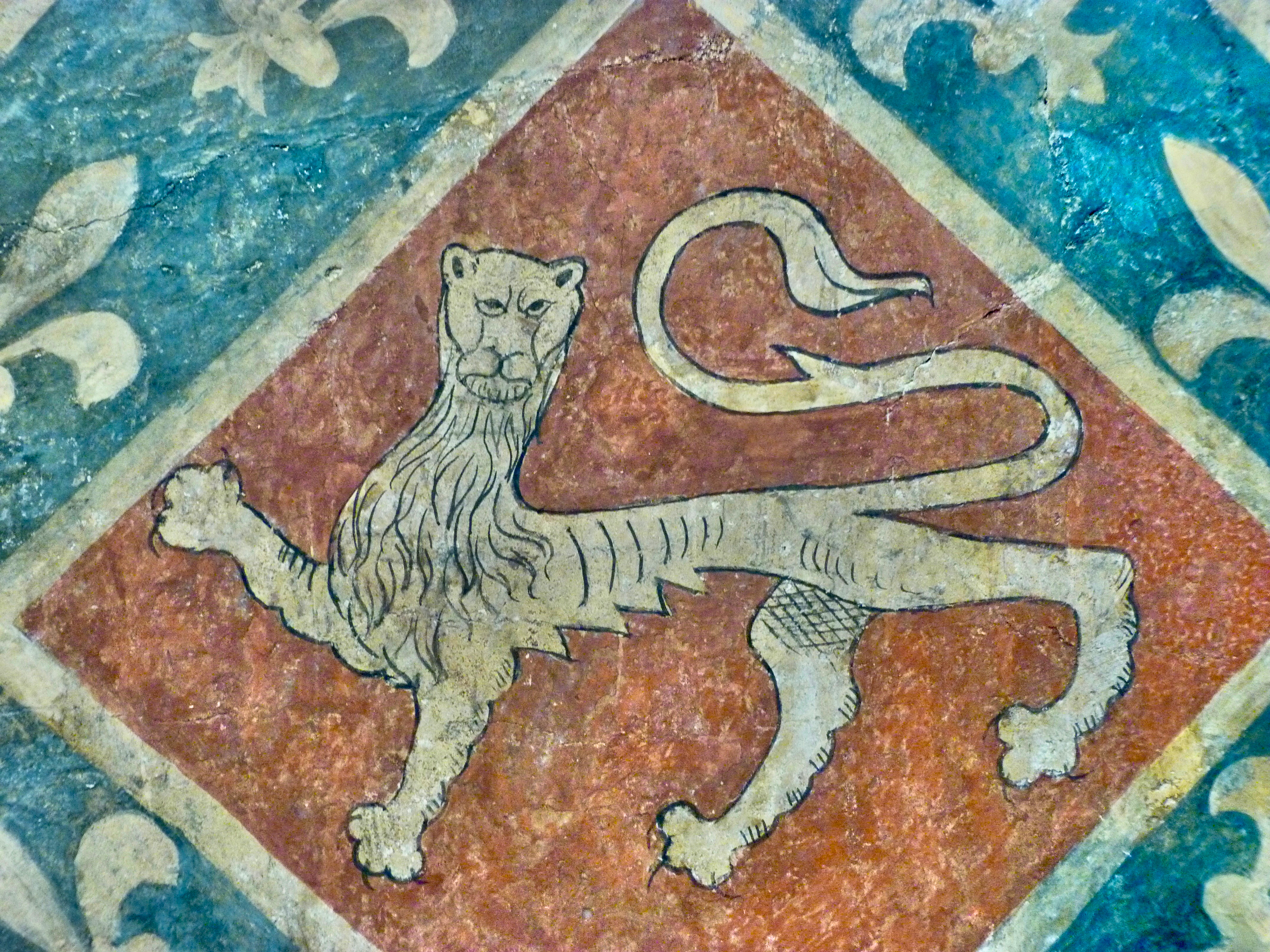 pintura de un león en el palacio Davanzati. El Palazzo Davanzati es uno de los palacios más antiguos de la ciudad de Florencia. Aunque fue construido en el siglo XIII, la familia que le da nombre no lo compraría hasta el XVI. Al ser una construcción previa al renacimiento y con su buen estado de conservación, el Palazzo Davanzati es uno de los ejemplos clave de arquitectura civil de la Florencia medieval.