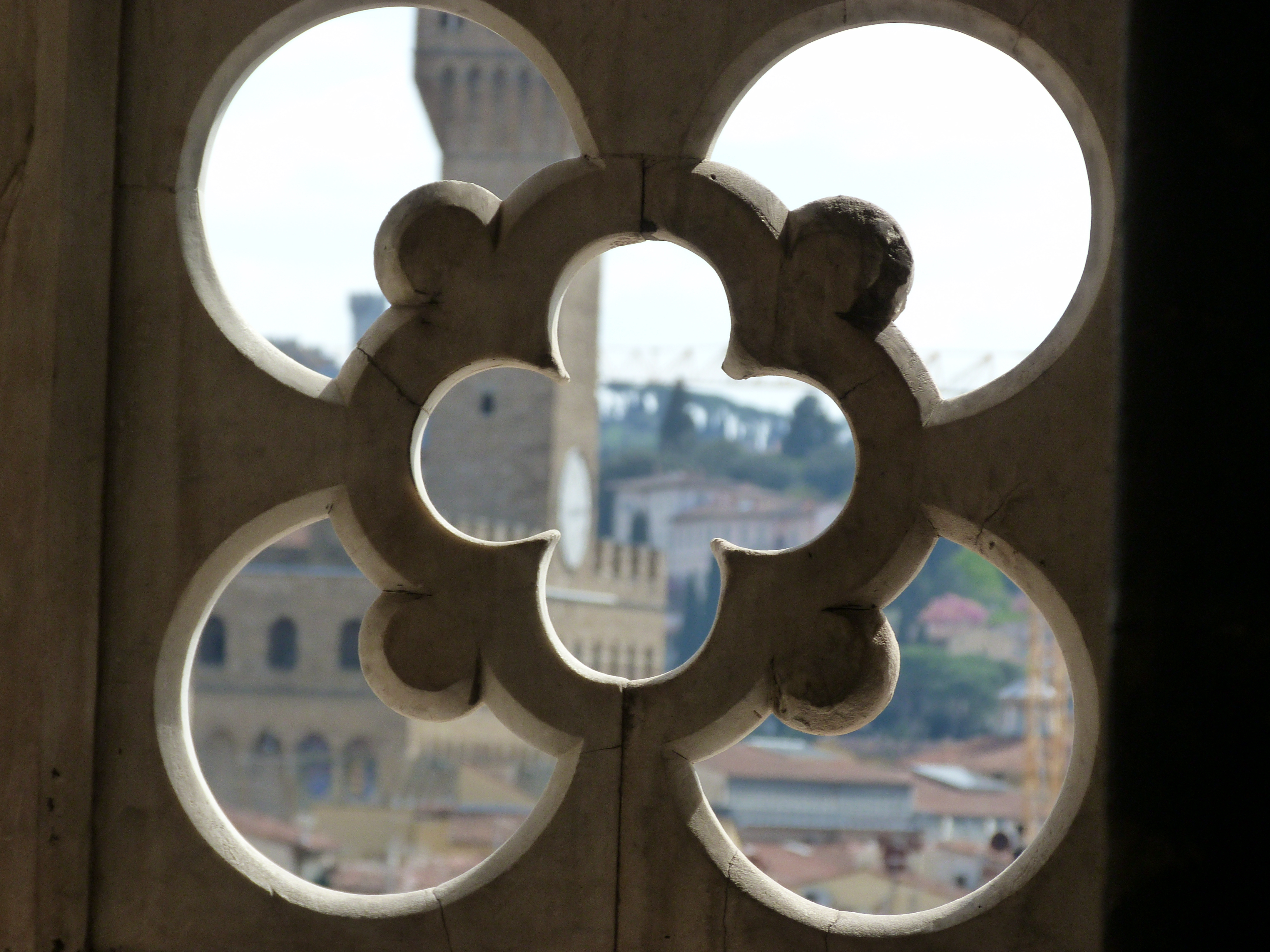 Interior del campanario o campanile de Giotto (en italiano: campanile di Giotto). Vista al exterior a través de sus decoraciones.