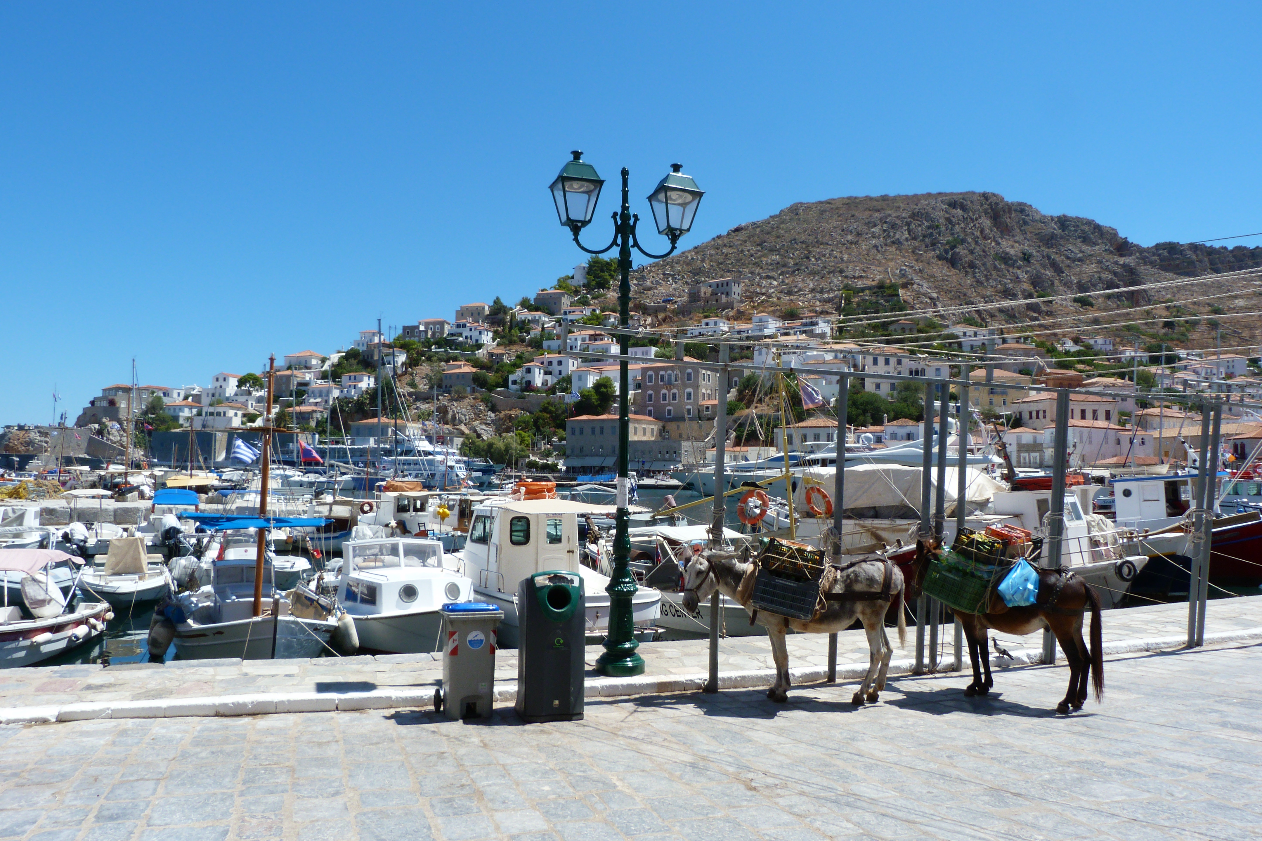 Vista del puerto de la isla de Hydra con los burros como sistema de transporte