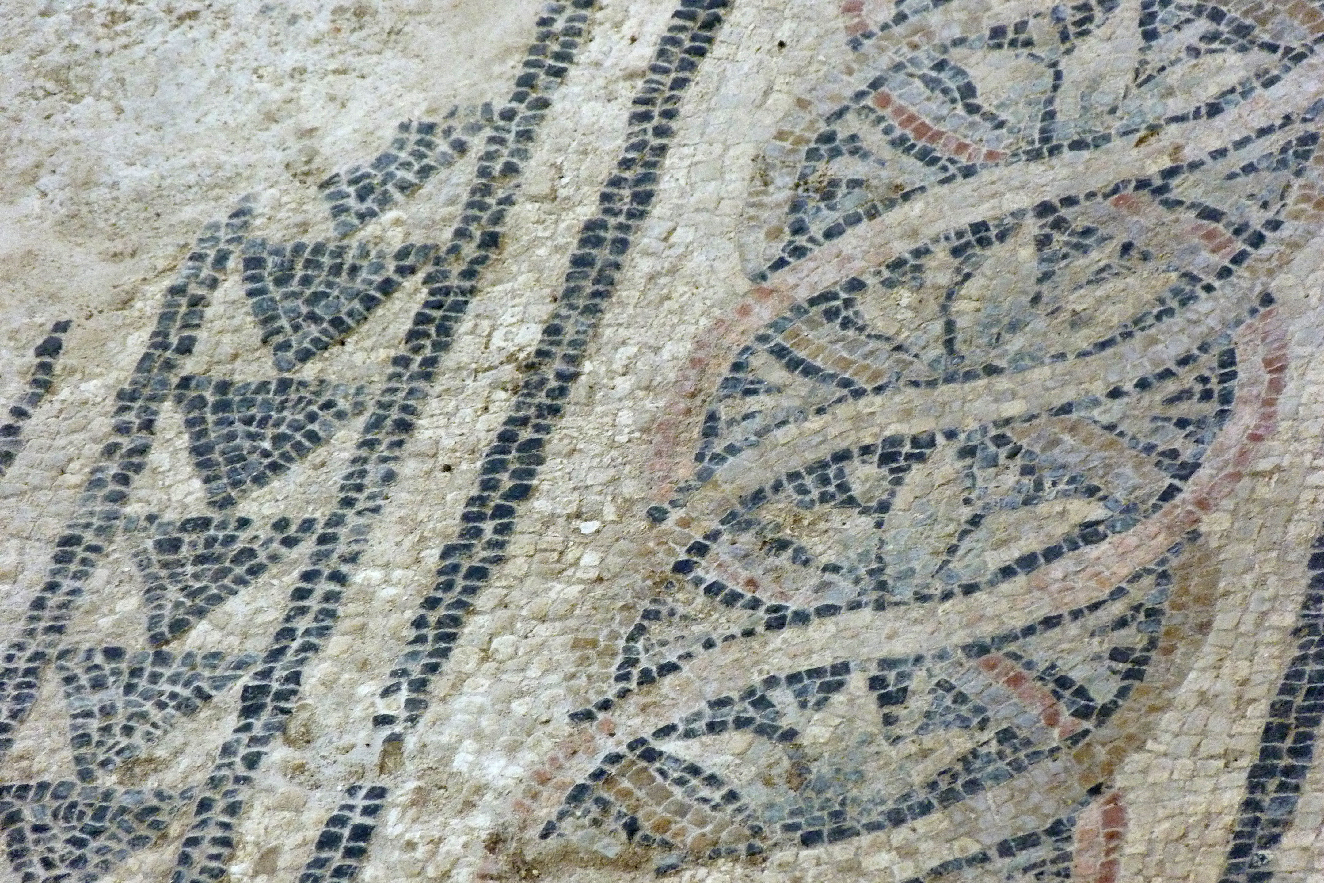 Primer plano de mosaico con cenefa geométrica y vegetal De la Villa romana de El Salar