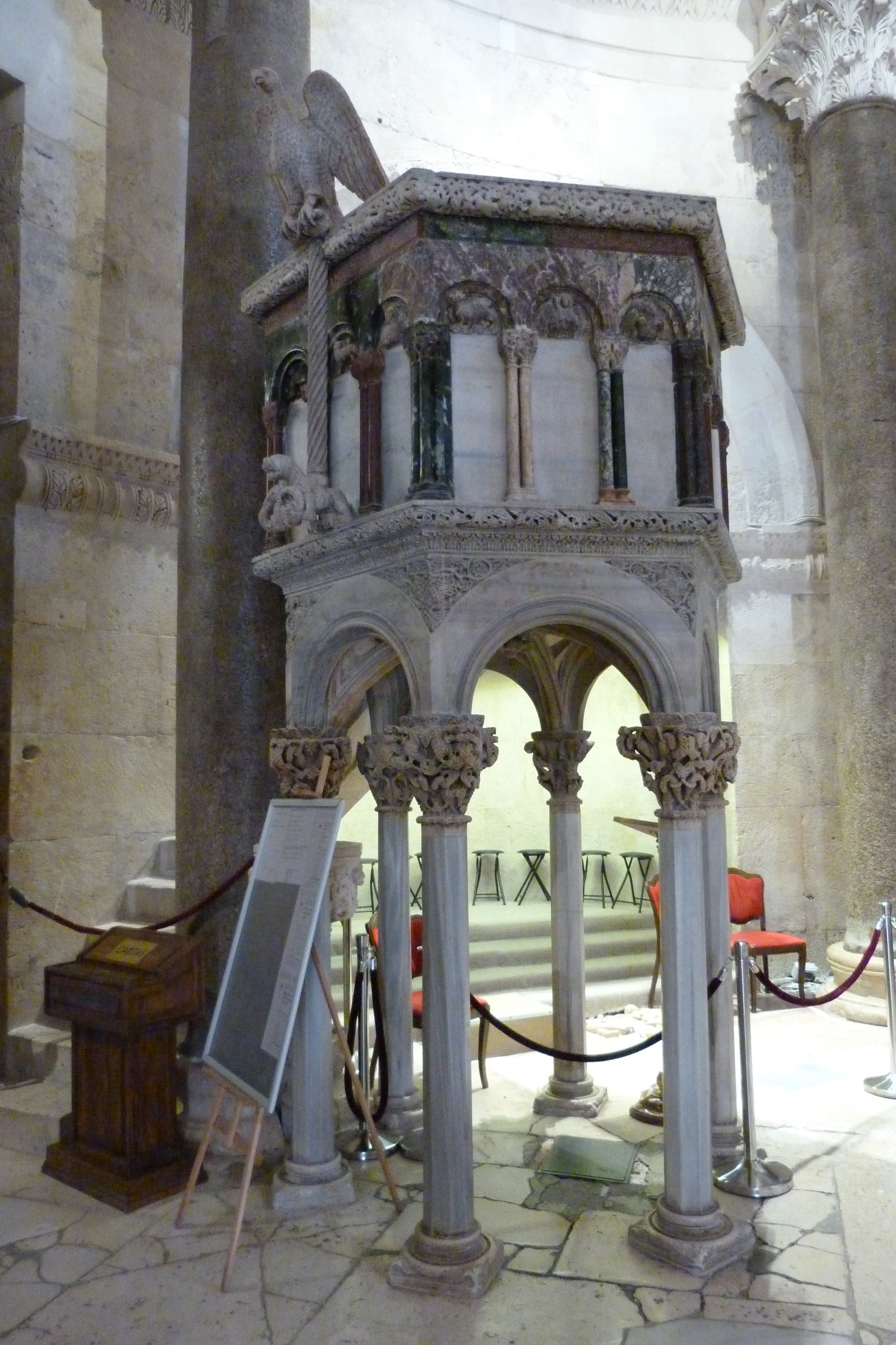 Púlpito del baptisterio en el interior de la Catedral de San Domnión en Split, Croacia.