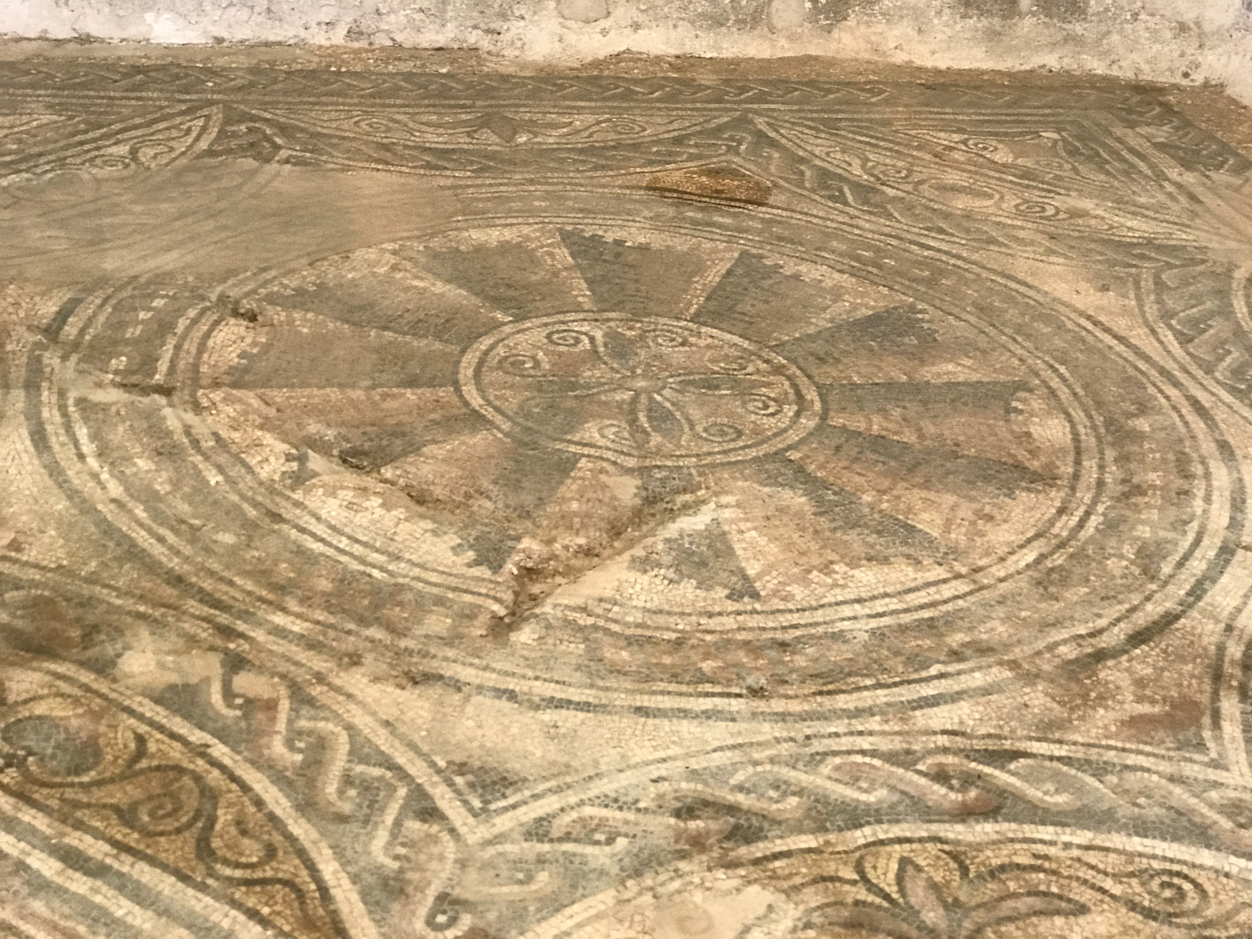 Mosaico romano de la Villa romana de Almedinilla. El yacimiento arqueológico de la villa romana "El Ruedo" se halla enclavado en el municipio de Almedinilla (Córdoba, España). De él se conocen por excavación dos núcleos: una villa romana, de la que se conserva bien la "pars urbana" y una necrópolis de inhumación.